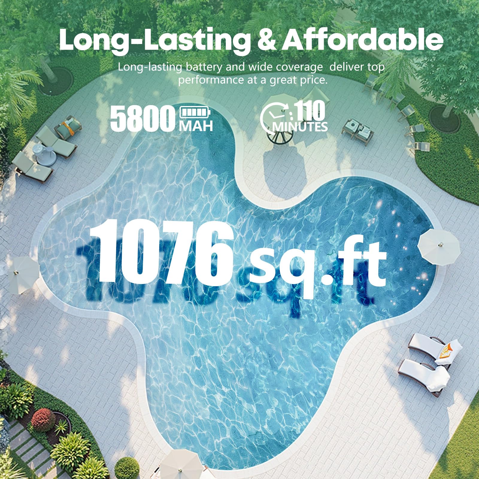 - 110-Min Runtime with Fast Recharge - Enjoy hands-free cleaning with a cordless robotic pool cleaner powered by a 5800mAh battery. It offers 110 minutes of runtime per charge and covers pools up to 1,076 sq.ft. Recharges in just 3.5 hours, perfect for daily use in flat inground and above-ground pools.