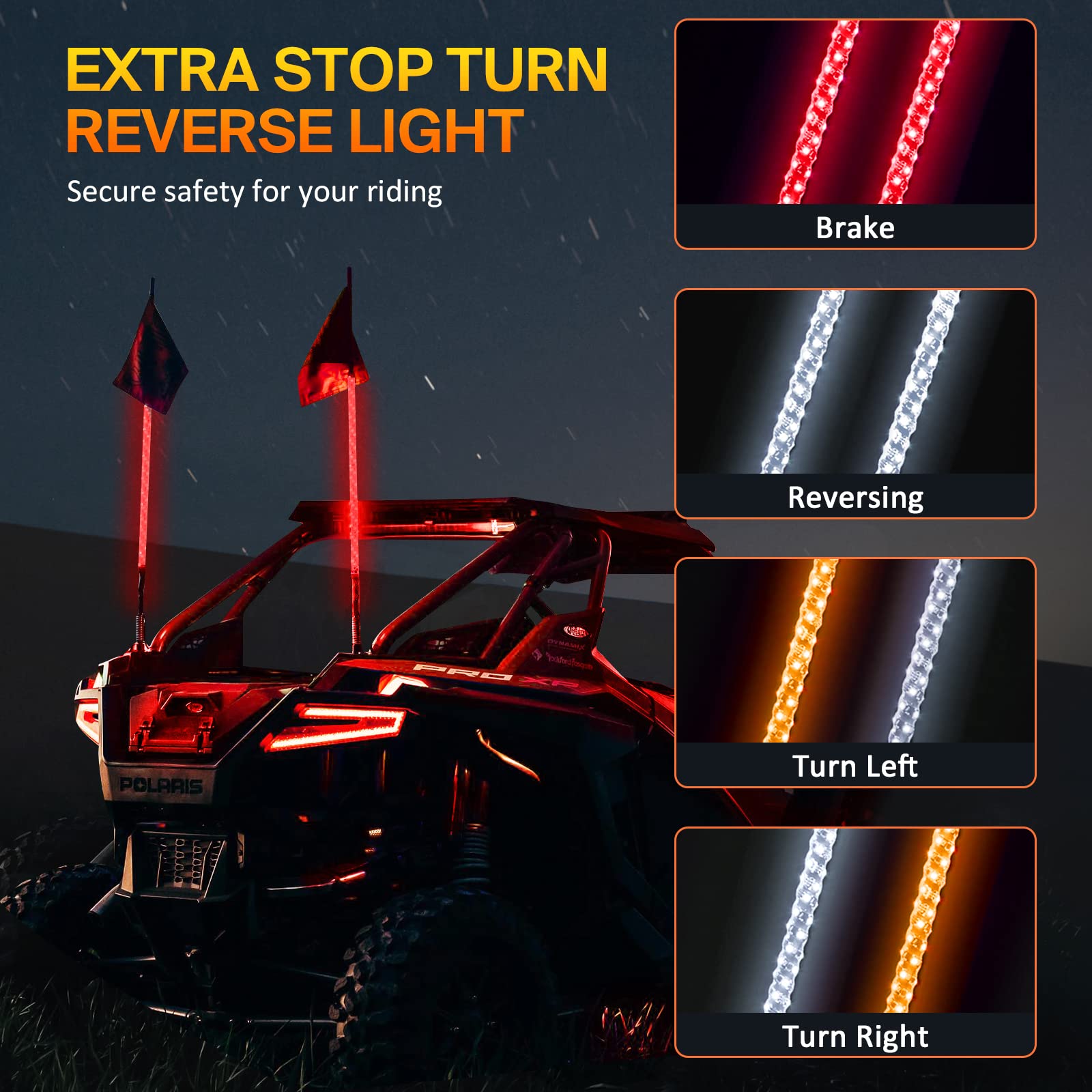- 【Music Synchronization & Turn Signal】Immerse yourself in your off-road journey with music sync mode, where the UTV whip lights dance to the rhythm of your phone music or voice. Enhance safety with SOS red stop/brake lights/amber turn signal lights/and white reverse lights for your SXS, RZR, or side by side