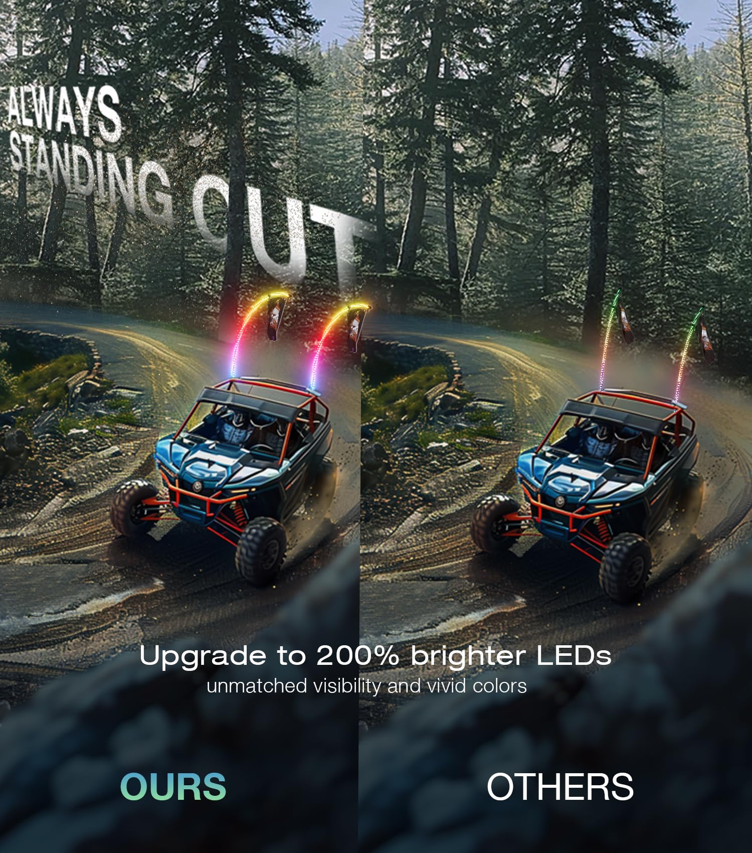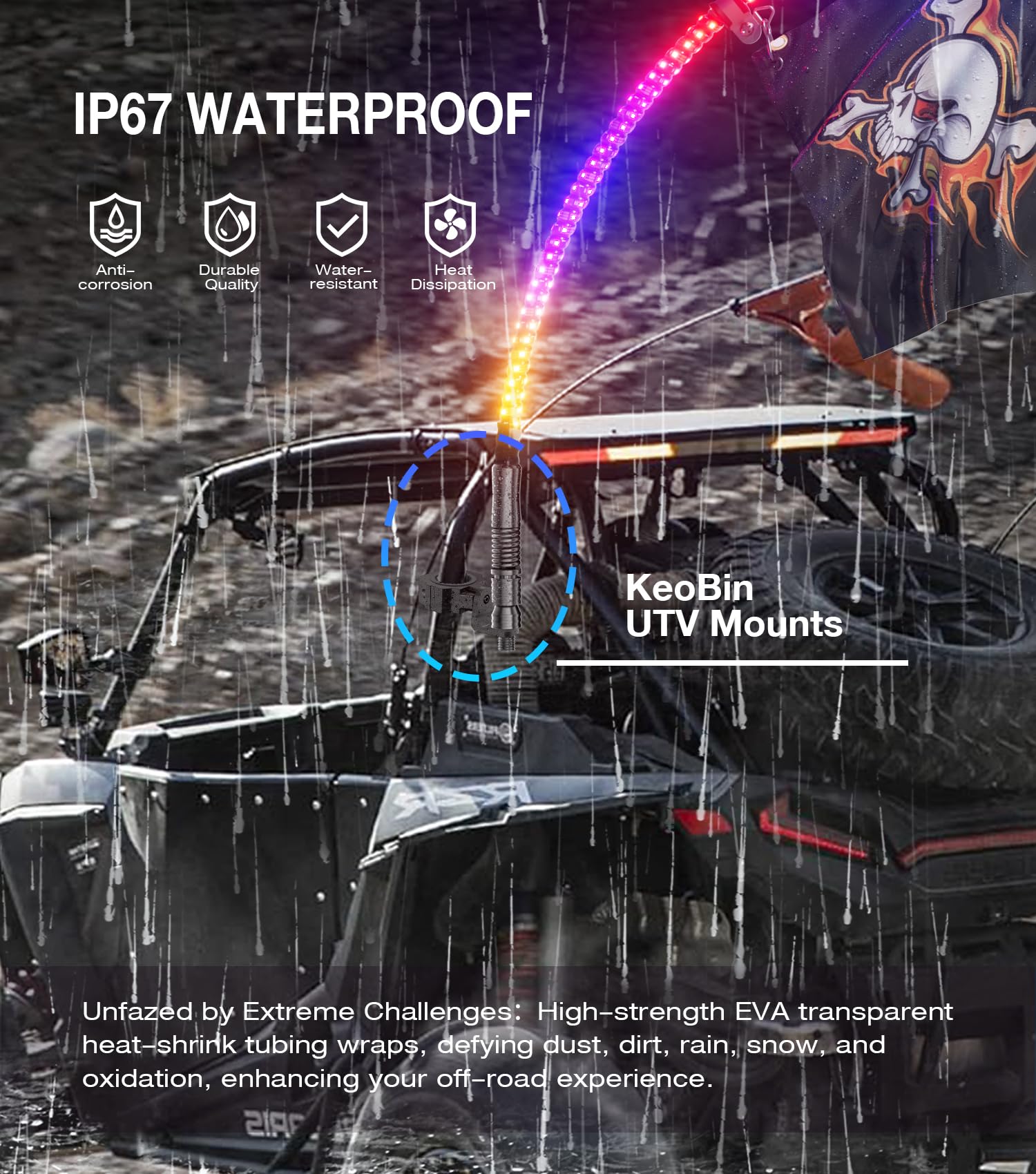 - 【Enhanced Integrated Spring Base】Say goodbye to bulky springs and base breakage. SXS whip lights side by side boast a reinforced integrated spring base for enhanced flexibility and pressure buffering, minimizing the risk of breakage during high-speed maneuvers, sharp turns, and vigorous rides. IP67 waterproof shockproof tube and high-toughness resin for unparalleled off-road durability, navigate challenging terrains worry-free