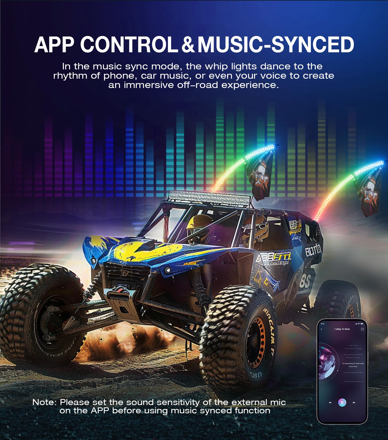 - 【300+ Dynamic Modes & Customizable UTV Whips】 5FT whip lights offer over 300 dynamic modes, including flowing, flashing, chasing, pulsing effects and innumerable solid colors. The 360° spiral illumination design ensures brilliant and uniform lighting, adding visual magic to off-road vehicles, ATVs, and 4-wheelers