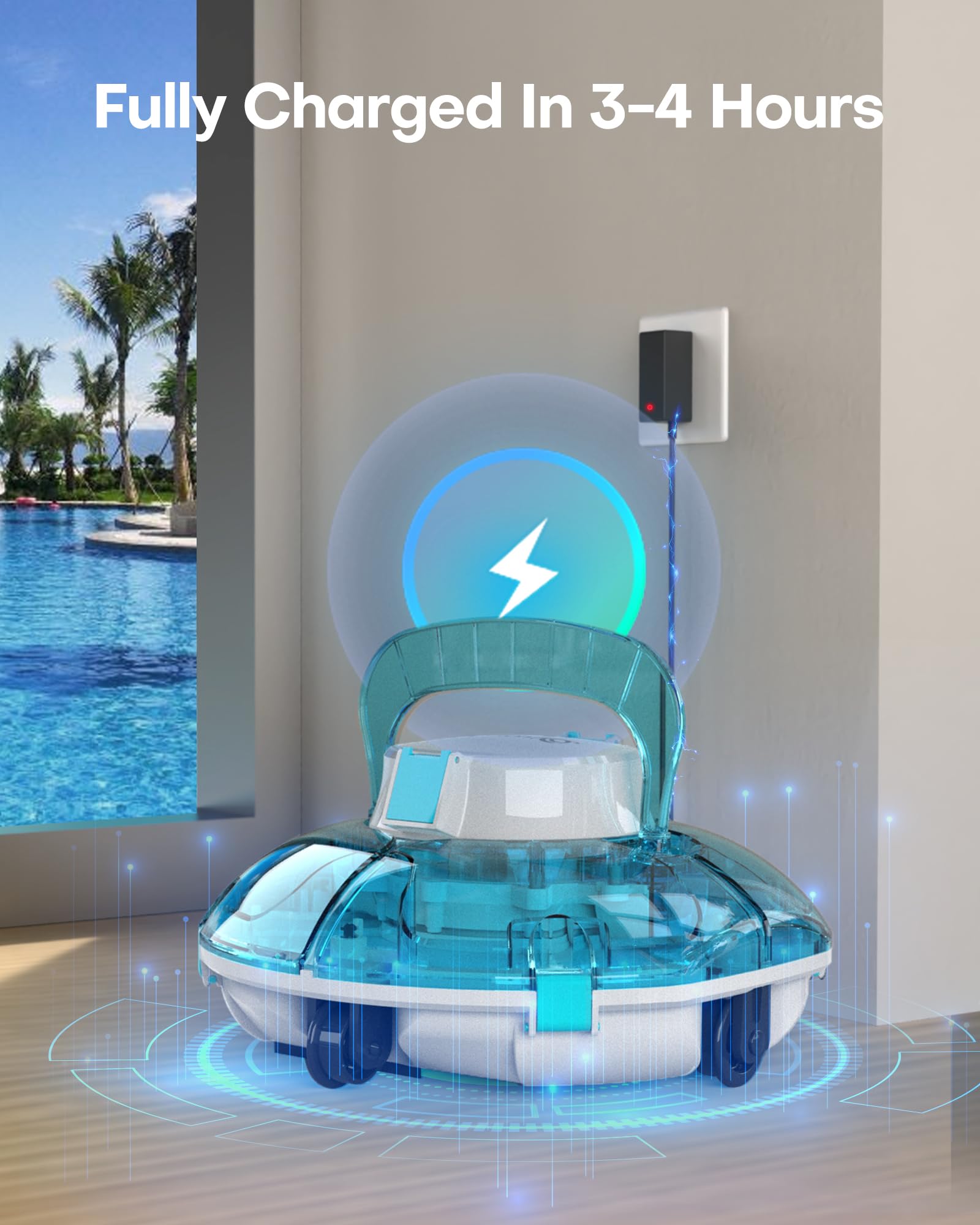 - 【Cordless & Self-Parking】 This automatic pool cleaner features a tangle-free design and intelligently docks itself when battery runs low. With just a 3-4 hour charge, the above ground pool cleaner delivers hands-free convenience for a spotless pool.