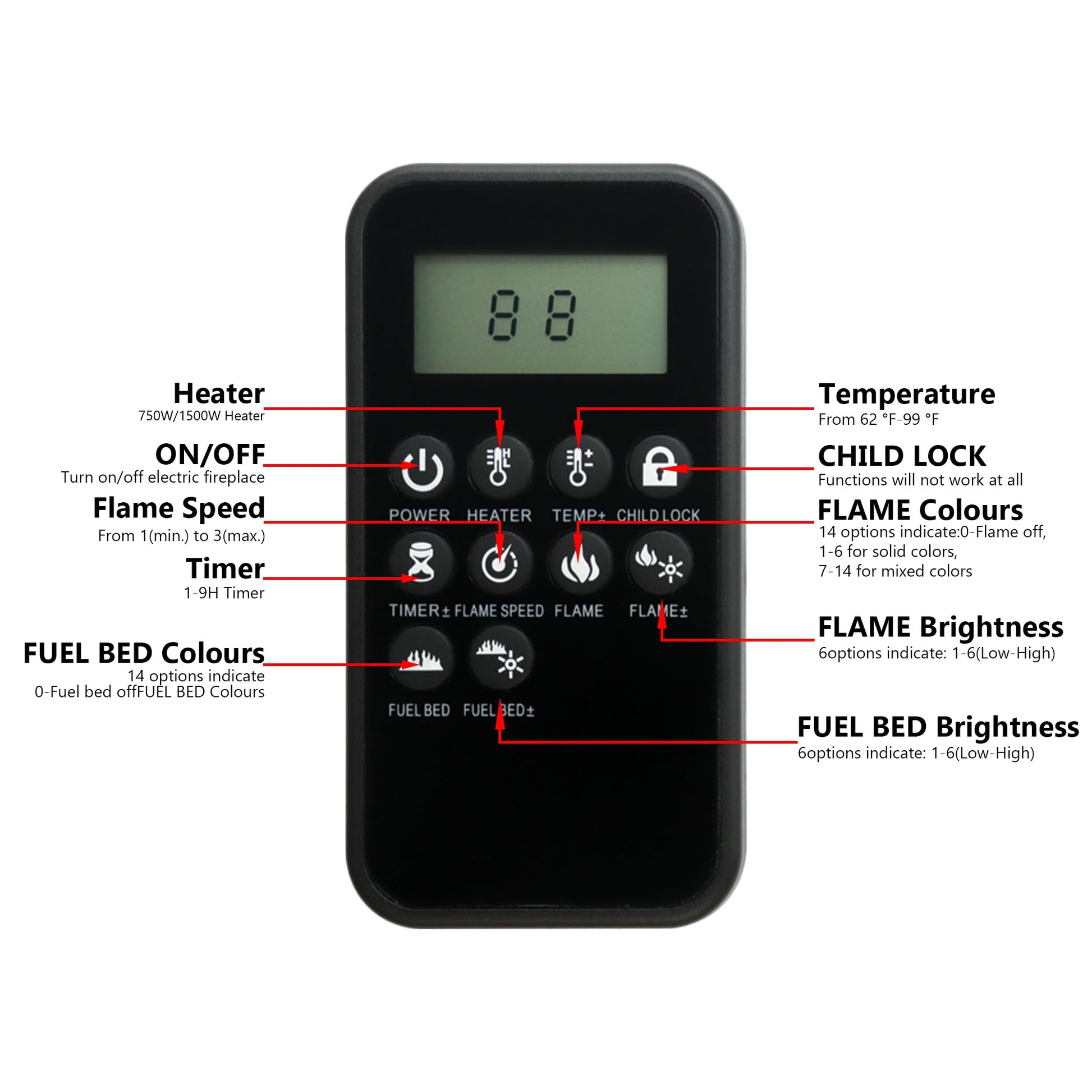 - More Functions: 1-9H timer;750/1500w heat settings.;62℉-99℉ Temperature Adjustment. The above functions can not only be controlled by the remote control but also by using the fireplace touch screen.