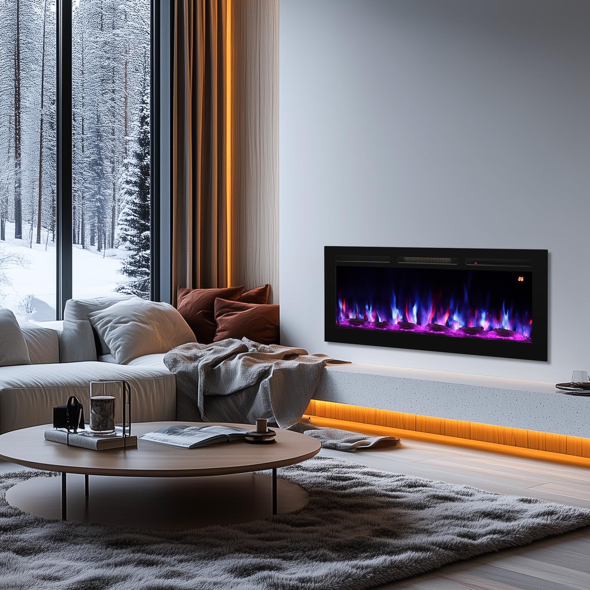 - Insert size: 43.92'W*15.72'H* 5.4'D, Overall size:48'W*17.72H*5.75'D. This electric fireplace can be wall-mounted, built-in, or standing. The heat exits to the front - Safe to go recessed in the wall.