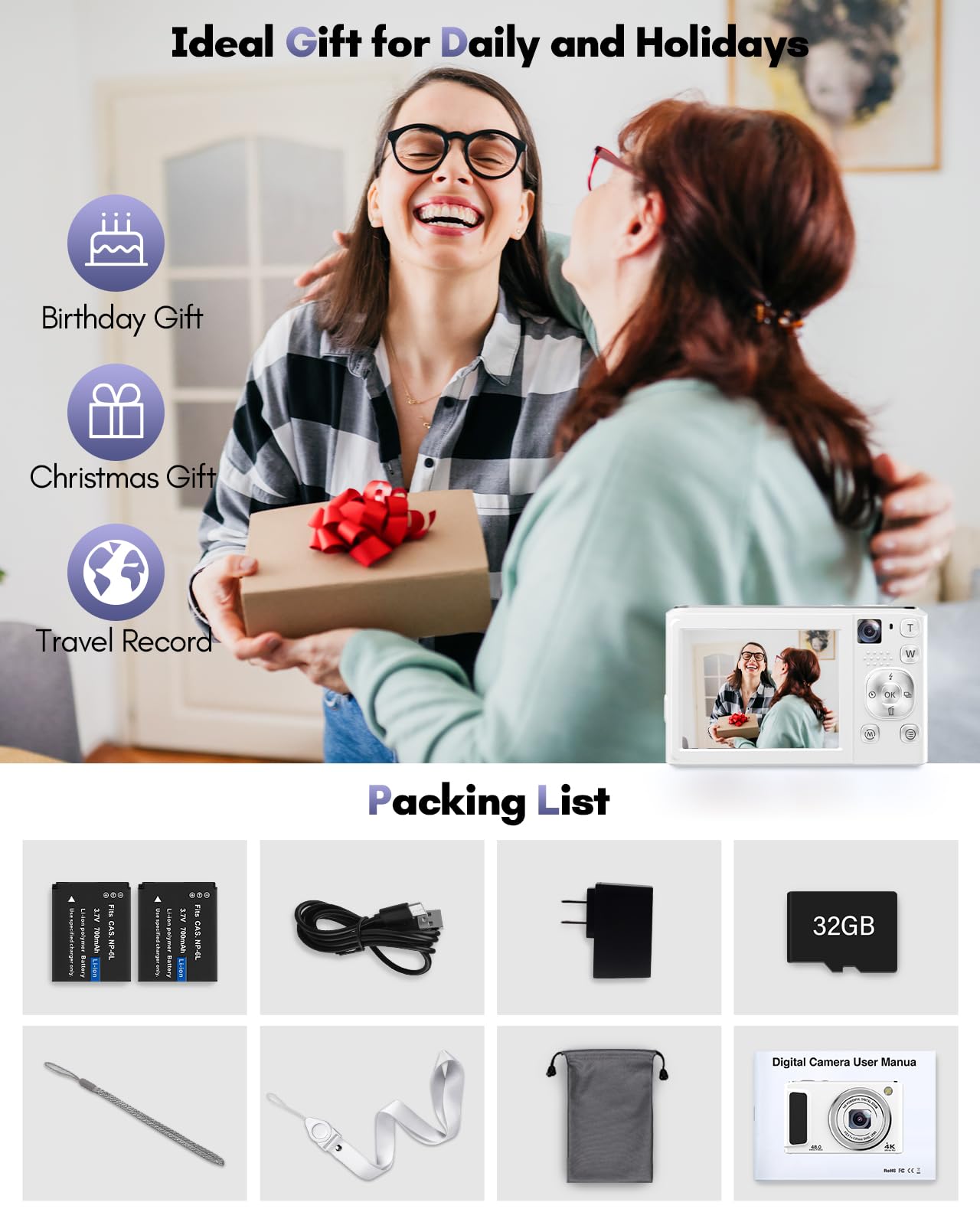 - 【Complete Camera Set: Ideal Choice】This point and shoot digital camera comes with a high-quality 32GB card, wrist strap, and lanyard to free your hands and prevent the camera from falling when not in use. We provide a comprehensive after-sales and 24/7 customer support. This camera is perfect for personal use and makes an ideal choice for children, teenagers, beginners, and the elderly. Whether for travel, vlogging, or daily photography, this camera can meet all your needs.