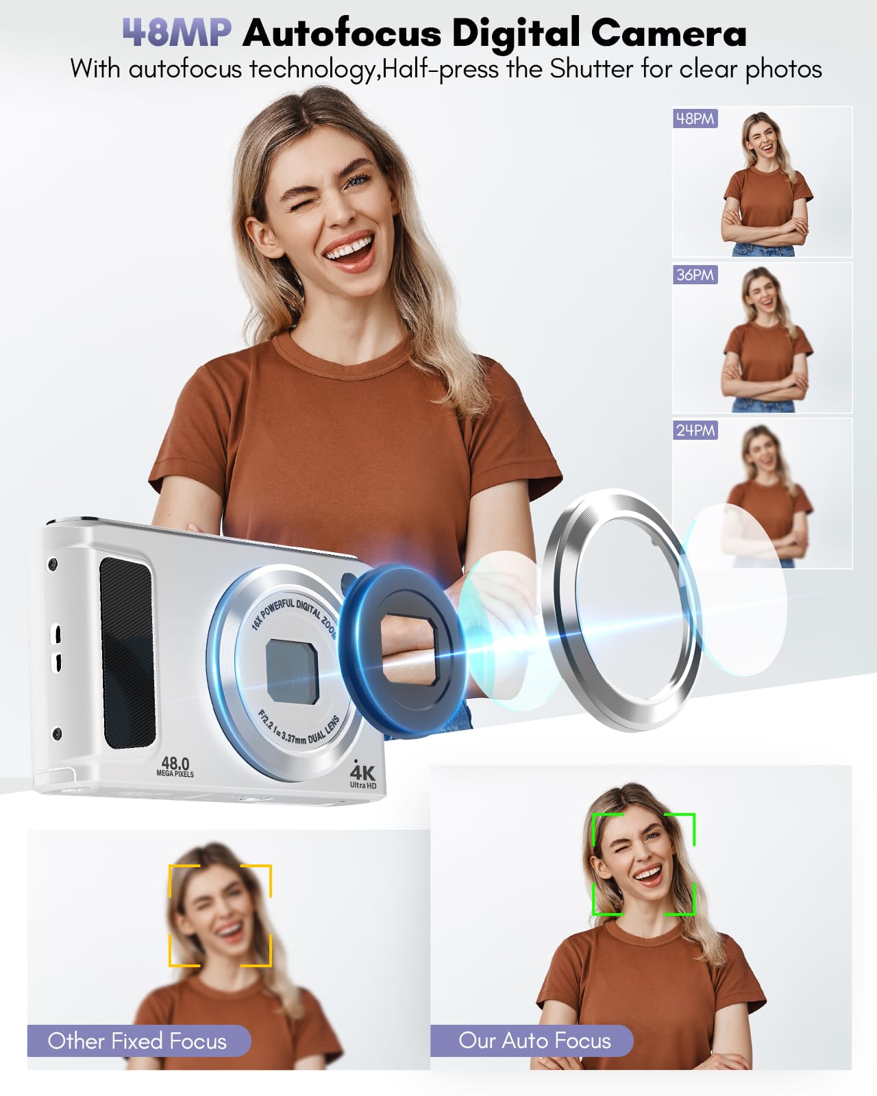 4K Digital Camera, 48MP Autofocus Cameras for Photography,Vlogging Compact Camera with Front and Rear Camera, 16X Zoom Protable Point and Shoot Cameras with 32GB SD Card,Anti-Shake,2 Batteries