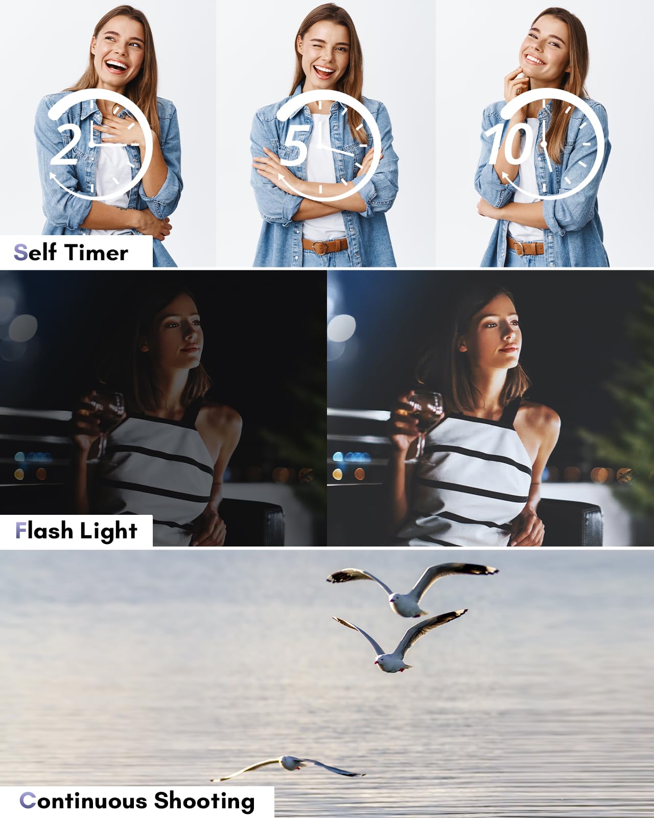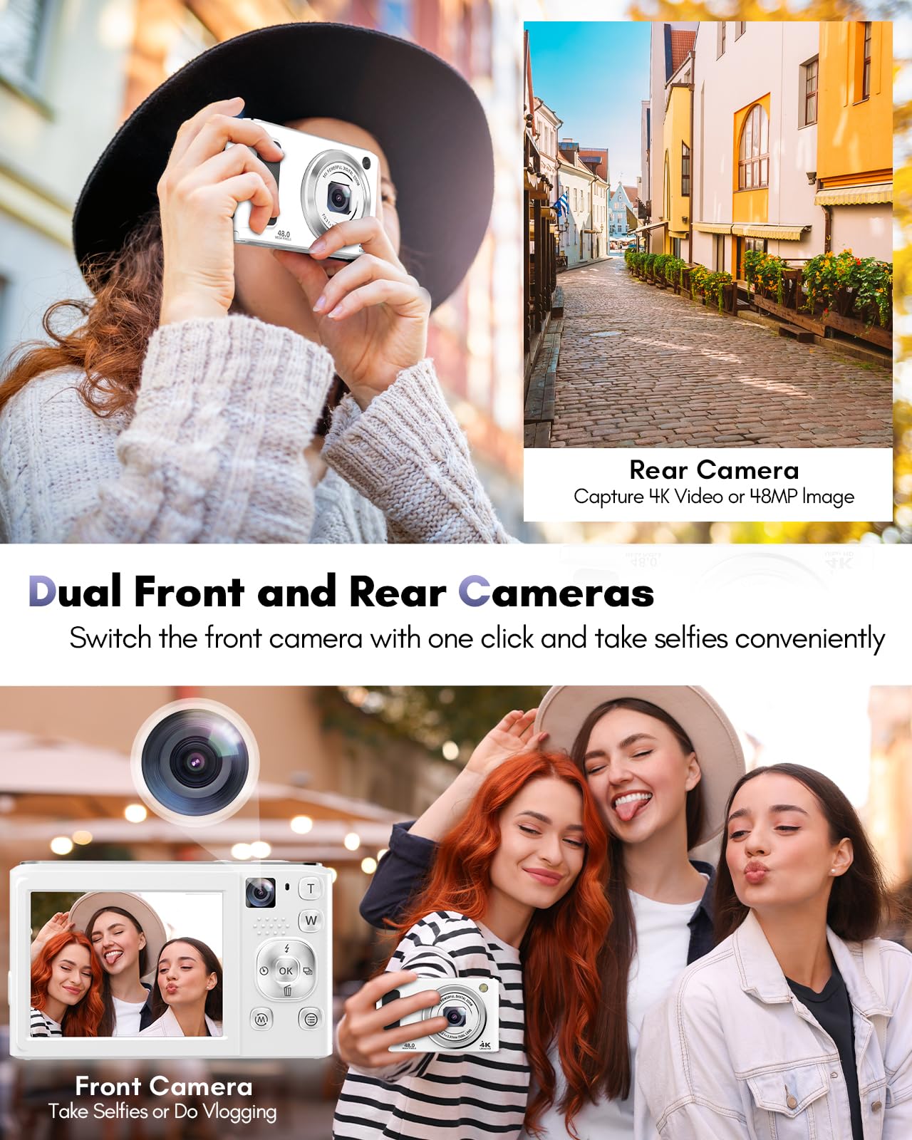 - 【48MP Dual-Lens Digital Camera, Easily Record Your Travels!】This digital camera uses the latest CMOS image sensor system, allowing you to easily capture stunning 48MP HD images. Equipped with dual lenses, it enables one-touch switching between selfies and landscape photos without the need for assistance. Even beginners can take amazing photos of people, scenery, selfies, and more during their travels!