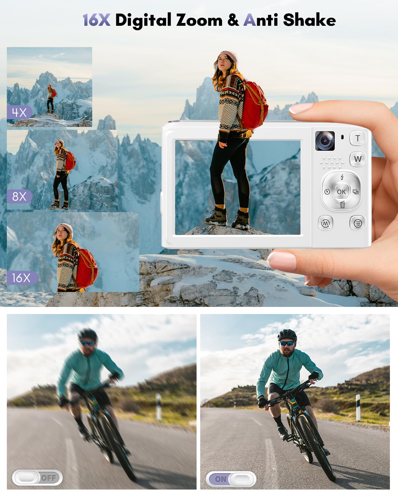 - 【Portable and Versatile Features】This portable small digital camera is equipped with a 2.8-inch IPS screen and is extremely lightweight, making it perfect for your pocket when you want to travel light without carrying a ton of lenses. This digital camera also offers a variety of image styles, self-timer(2/5/10S), 3-continuous shooting, face recognition, anti-shake can make the picture stable and clear, and fill light allows you to take high-quality photos in low-light conditions.