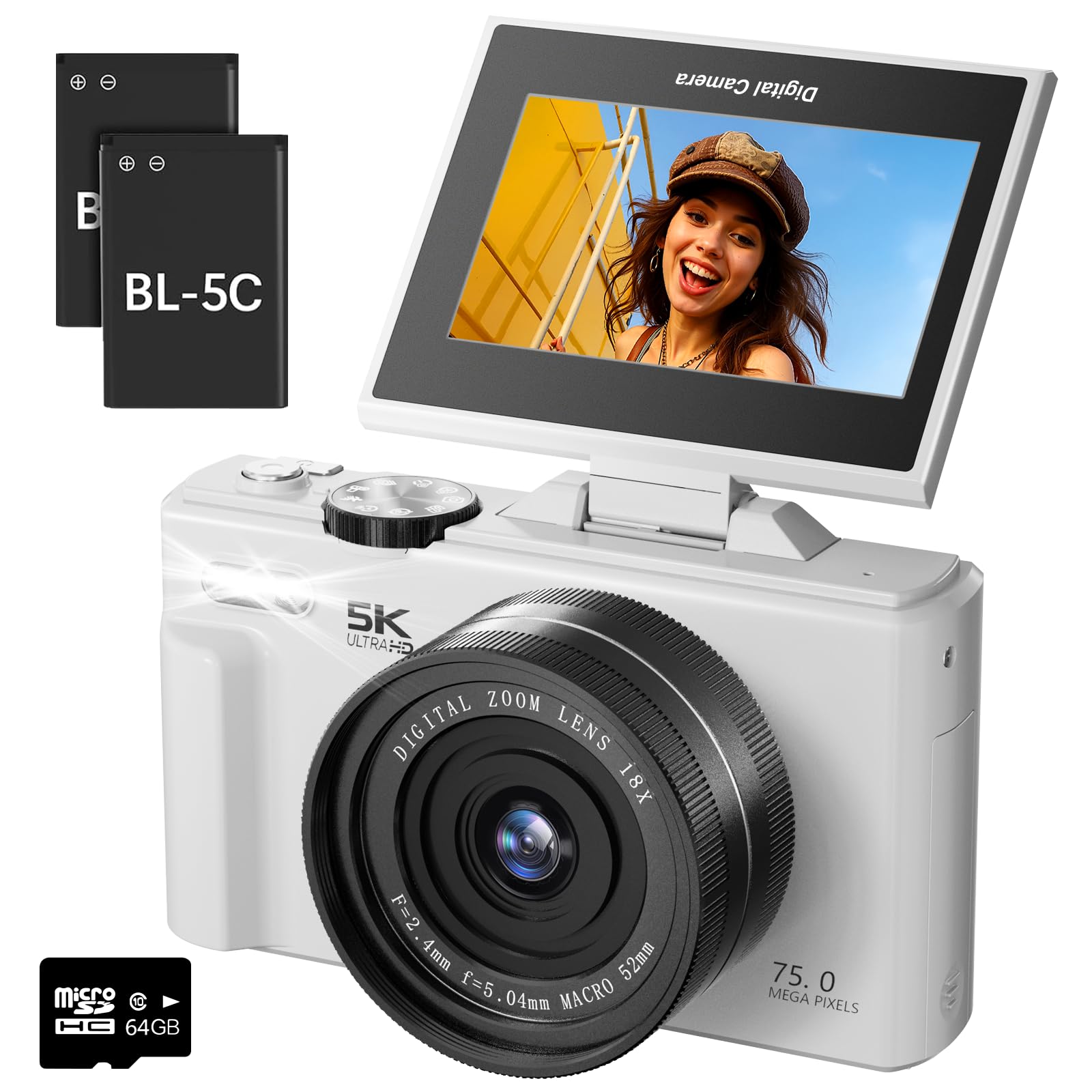 5K Digital Camera for Photography - 75MP Autofocus Vlogging Camera for YouTube with 64GB SD Card, WiFi, 18X Zoom 3" 180° Flip Screen Compact Travel Camera with 2 Batteries for Teens and Beginner