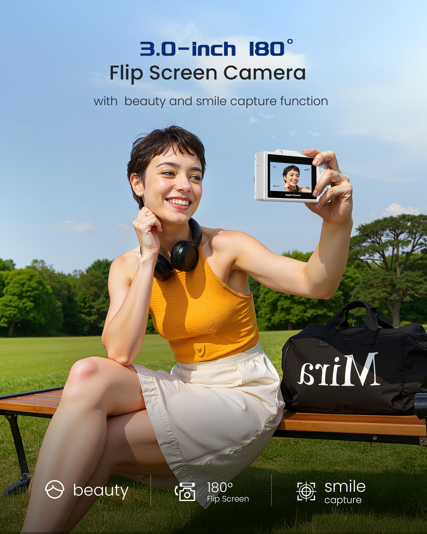 - 【3.0-inch Flip Screen for Selfie Function】This vlogging camera features a 3.0-inch IPS 180° flip screen, allowing you to easily adjust shooting angle to capture your perfect shot, making it ideal for selfie lovers and video bloggers. Weighing just 232g, the vlog camera is lightweight and includes a standard tripod screw. With built-in anti-shake, continuous shooting, time-lapse, slow-motion and smile capture modes, it’s perfectly suited for travel and capturing every memorable moment.