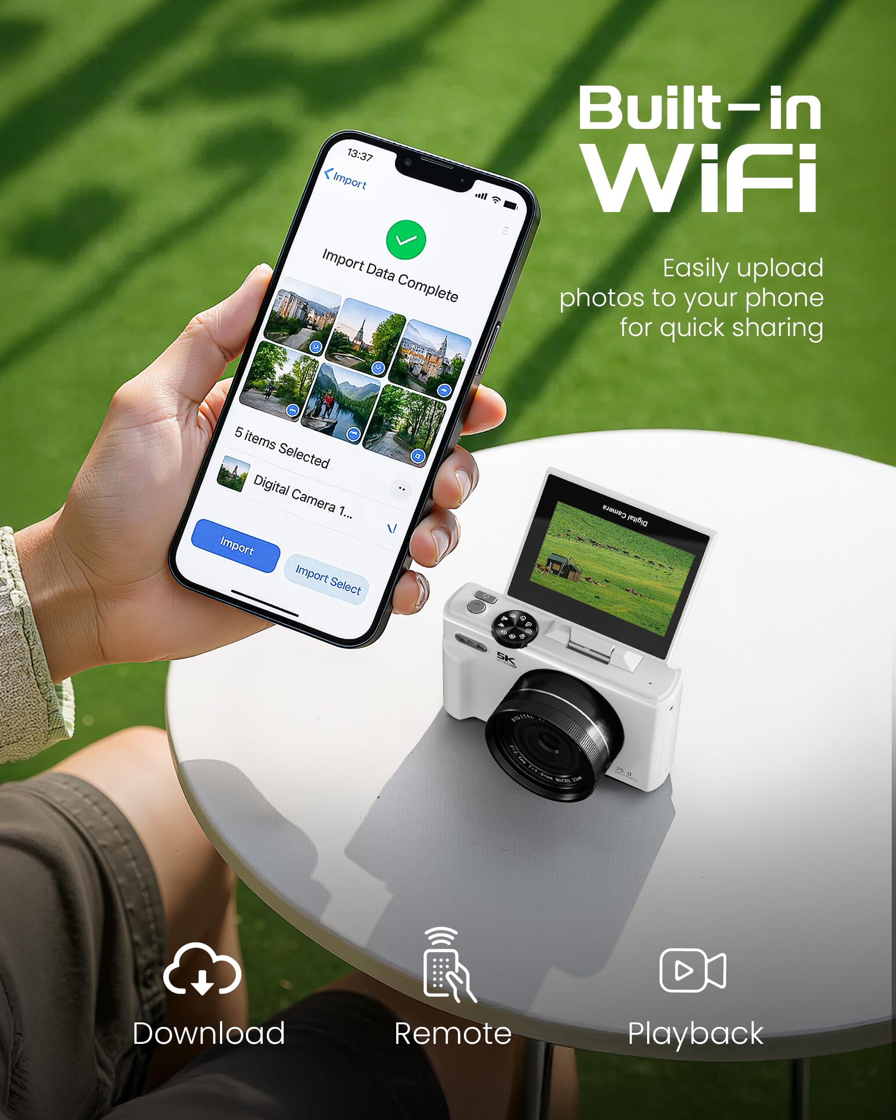 - 【5K & 75MP Digital Camera】This digital camera shoots incredible 5K video (15FPS) and 75MP high-resolution photos, equipped with a 12MP CMOS sensor that brings vibrant colors and sharp details to life, whether in bright sunlight or a dimly lit room. It's perfect choice for your vlogging and YouTube needs, effortlessly capturing exciting moments of everyday life. The built-in flash ensures clear, bright photos even in low-light environments.