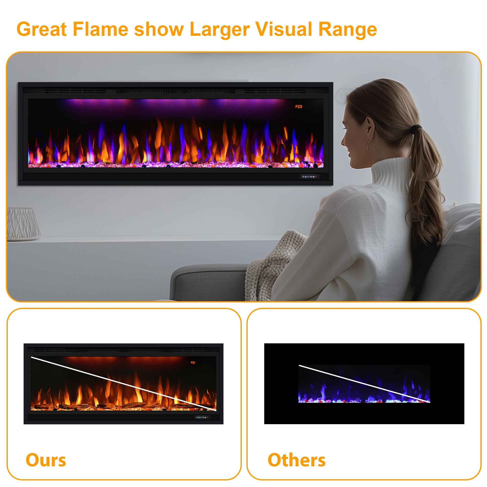 - 🔥High-quality Material& Stylish Looks: Linear& slim design shows the modern sense, fit for a variety of decoration styles and living environment. The frame of the electric fireplace is made of high-strength metal plate, anti-rust and anti-pressure with the thickened tempered glass panel for clear protection. When the hot air starts, the glass panel still be cool to touch, but please avoid to cover it or close to the hot air outlet.