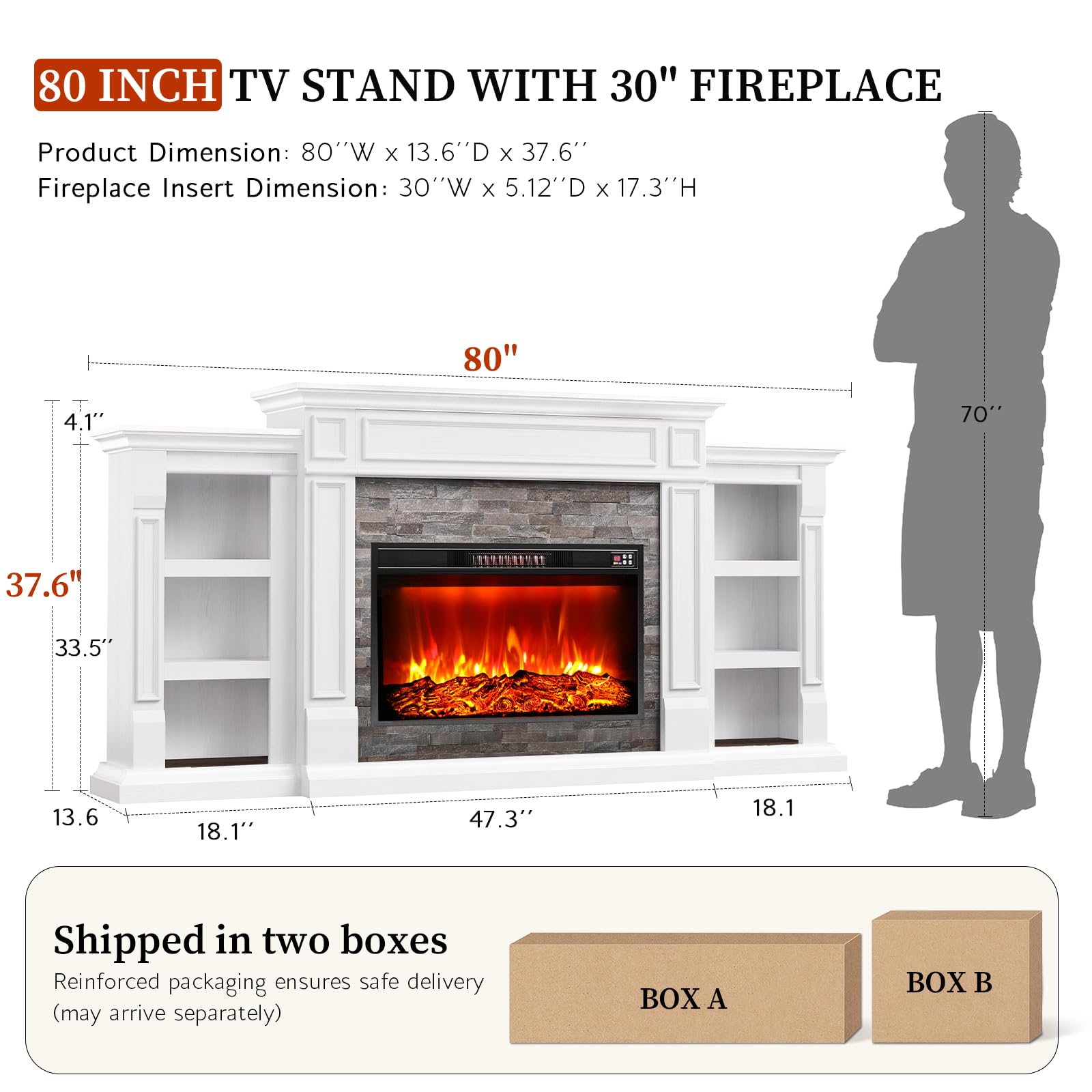 - 【Sustainable wood】 Sustainably Sourced, Eco-Friendly Choice for a Greener Planet! The fireplace with mantel dimension: 13.6'' D x 80'' W x 37.6'' H. The fireplace insert dimension: 30'' W x 5.12'' D x 17.3'' H