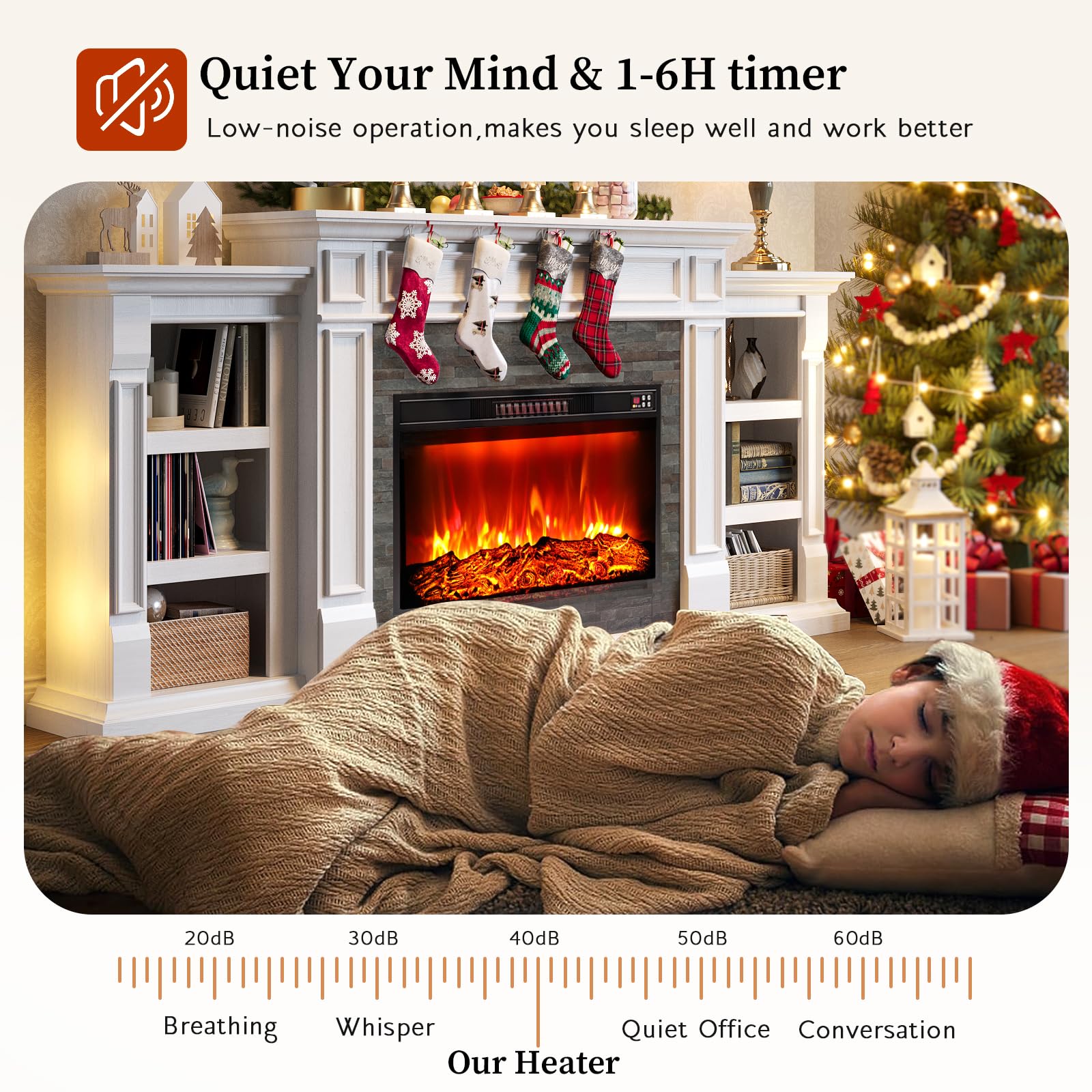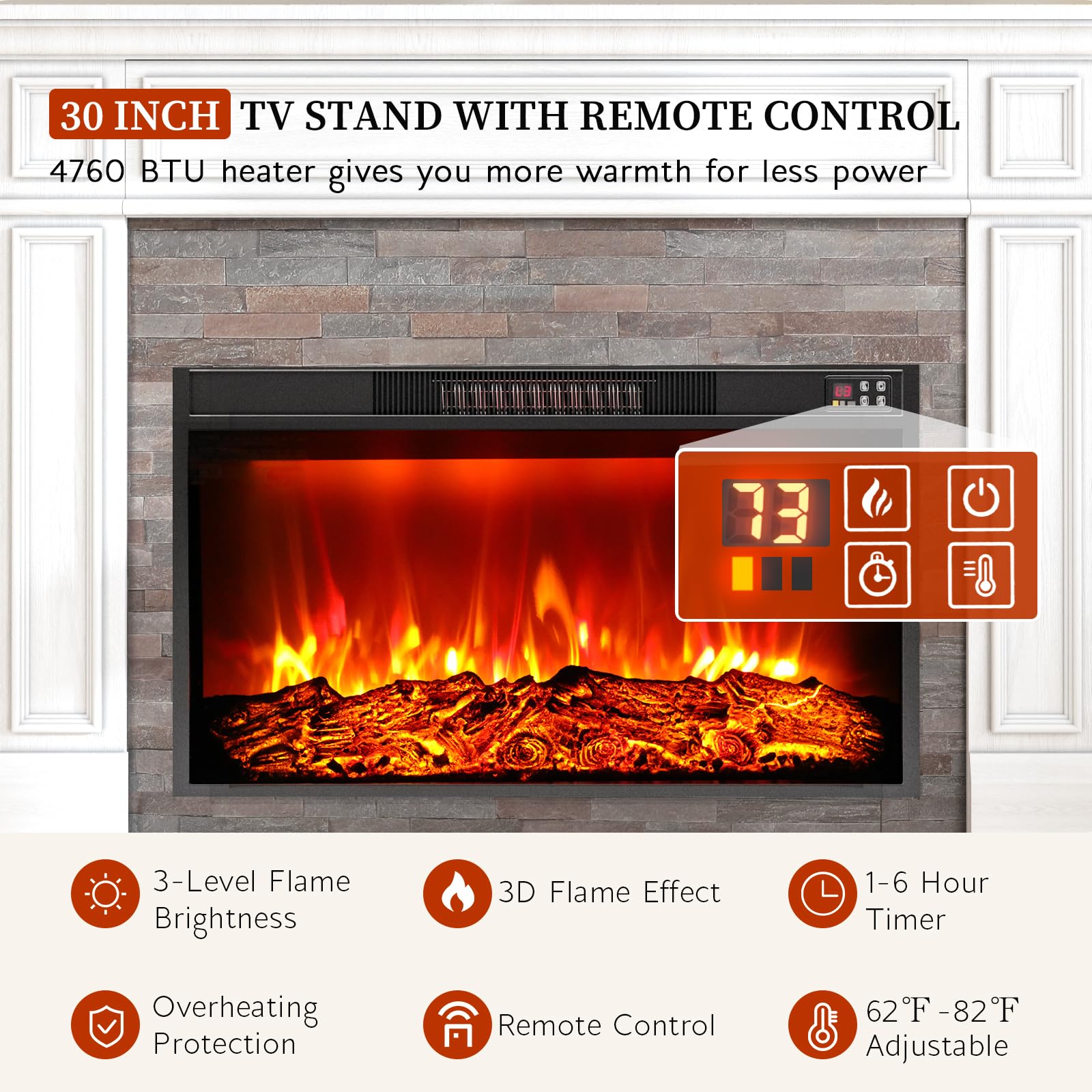 - 【30'' Electric Fireplace with Efficient Heating】With the efficient heating ability, the 1400W fireplace heater has a high power output of 5,000 BTU, warming up 400 square foot room for a constantly warm and comfortable environment.
