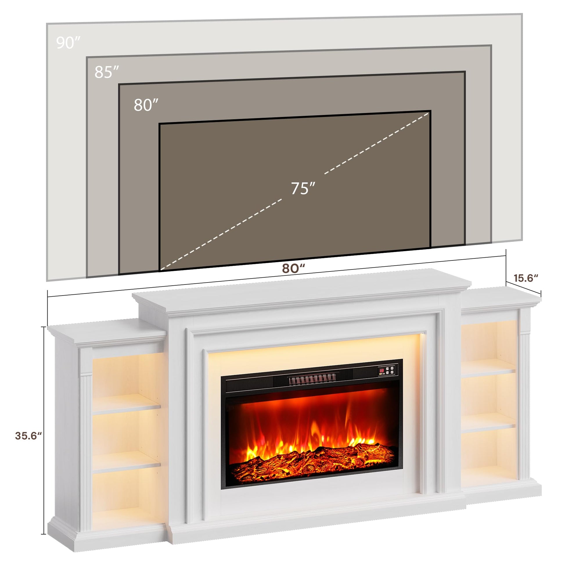 - 【Dimensions】The electric fireplace with mantel dimension: 13.6'' D x 80'' W x 37.6'' H. The fireplace insert dimension: 30'' W x 5.12'' D x 17.3'' H. Battery Model:CR2025. Battery Voltage:3.0V. Battery capacity:150mAh.