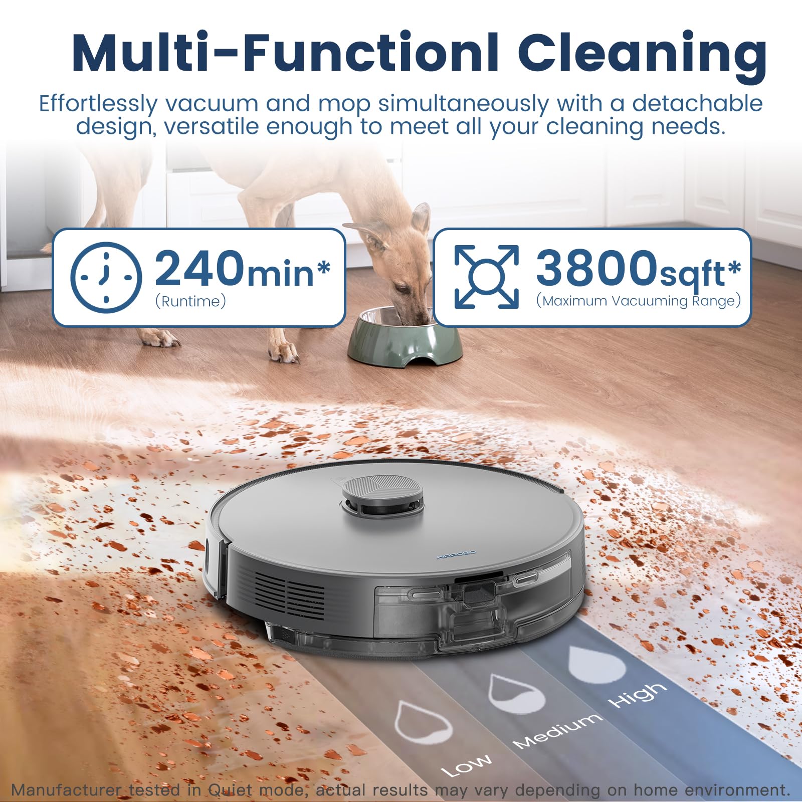 - 60 days of Hands-Free Cleaning: The AIRROBO T25+ robot vacuum self emptying base station is equipped with a 3.5L dust bag capacity to 60 days of hands-free dust disposal, so you don't have to do it manually or frequently. The robotic vacuum cleaner and mop combination comes with a 340 ml water tank with 3 levels of water output adjustment.In addition, the vacuum robot has a running time of up to 240 minutes, cleaning the entire home.