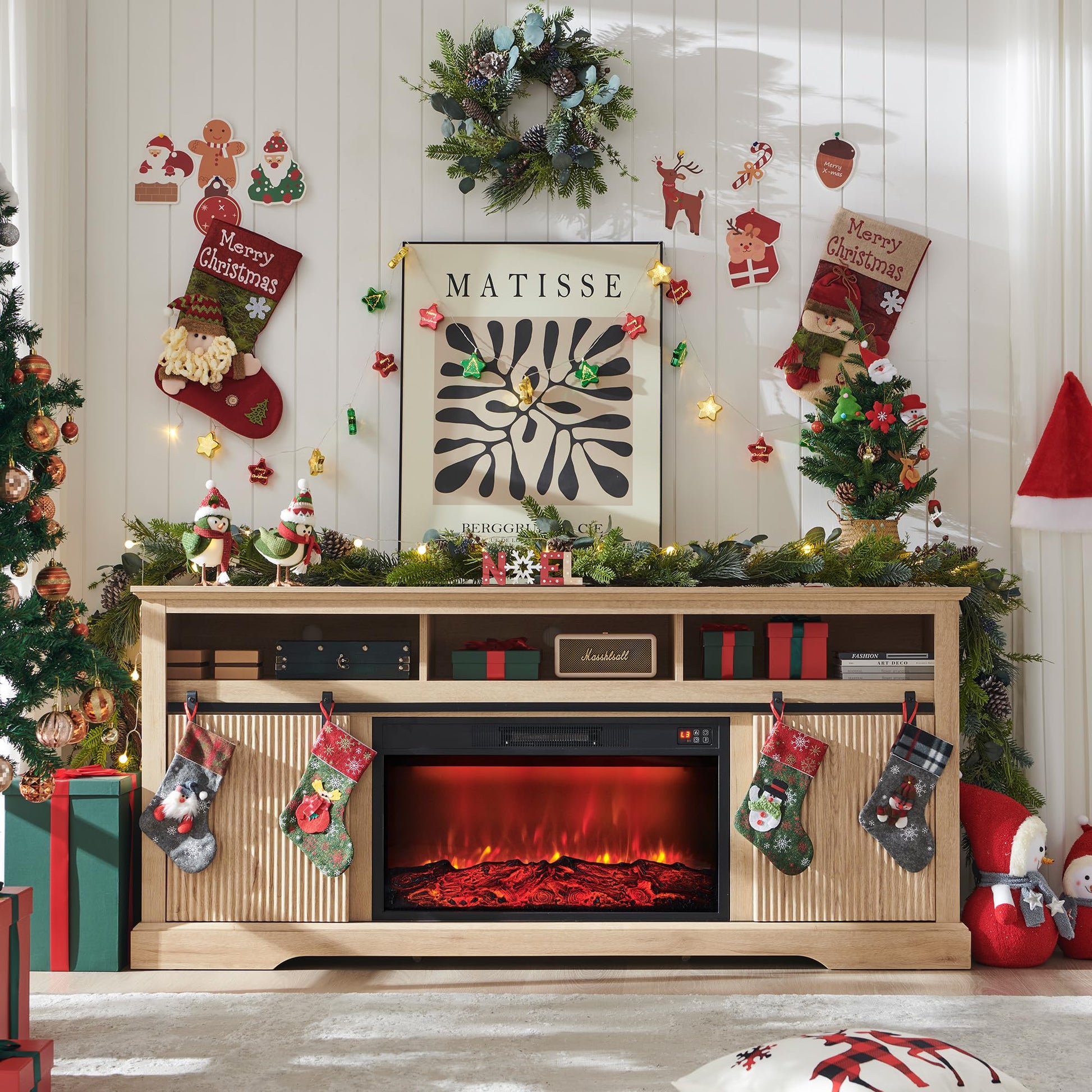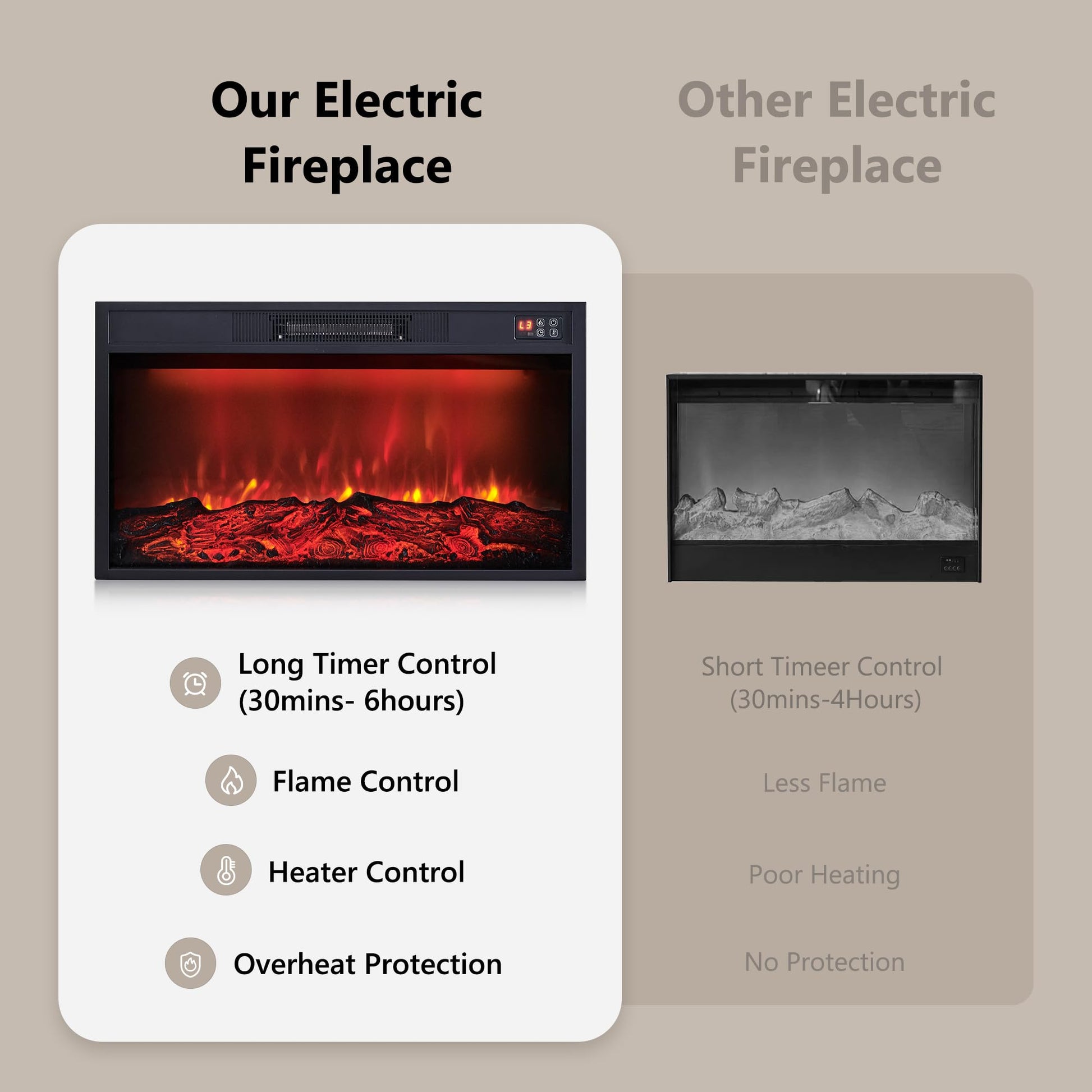 - SAFETY: There is a thermostat limiter inside the heater. When the inner temperature overheat or abnormal heating occurs, the thermostat protective device cuts off the power supply to avoid fireplace from damaged or risk of fire.