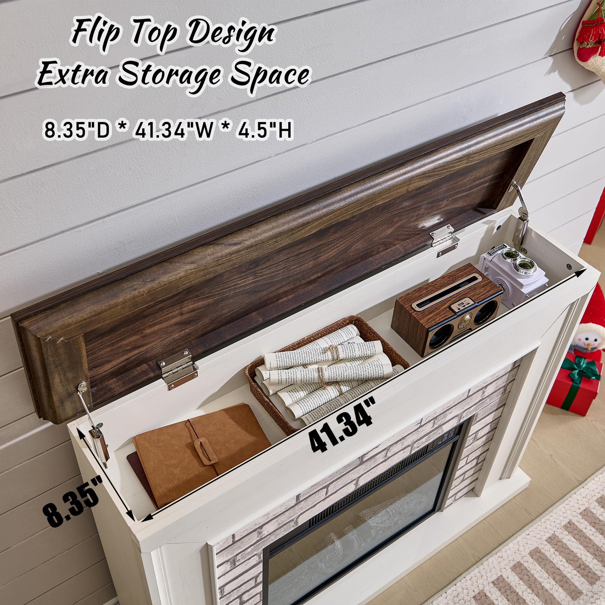 Aitjunz 45" Flip Top Electric Fireplace with Mantel, Electric Fireplace Heater, TV Stand with Freestanding Electric Fireplaces, Remote Control, Adjustable Flame Level for Living Room (White)