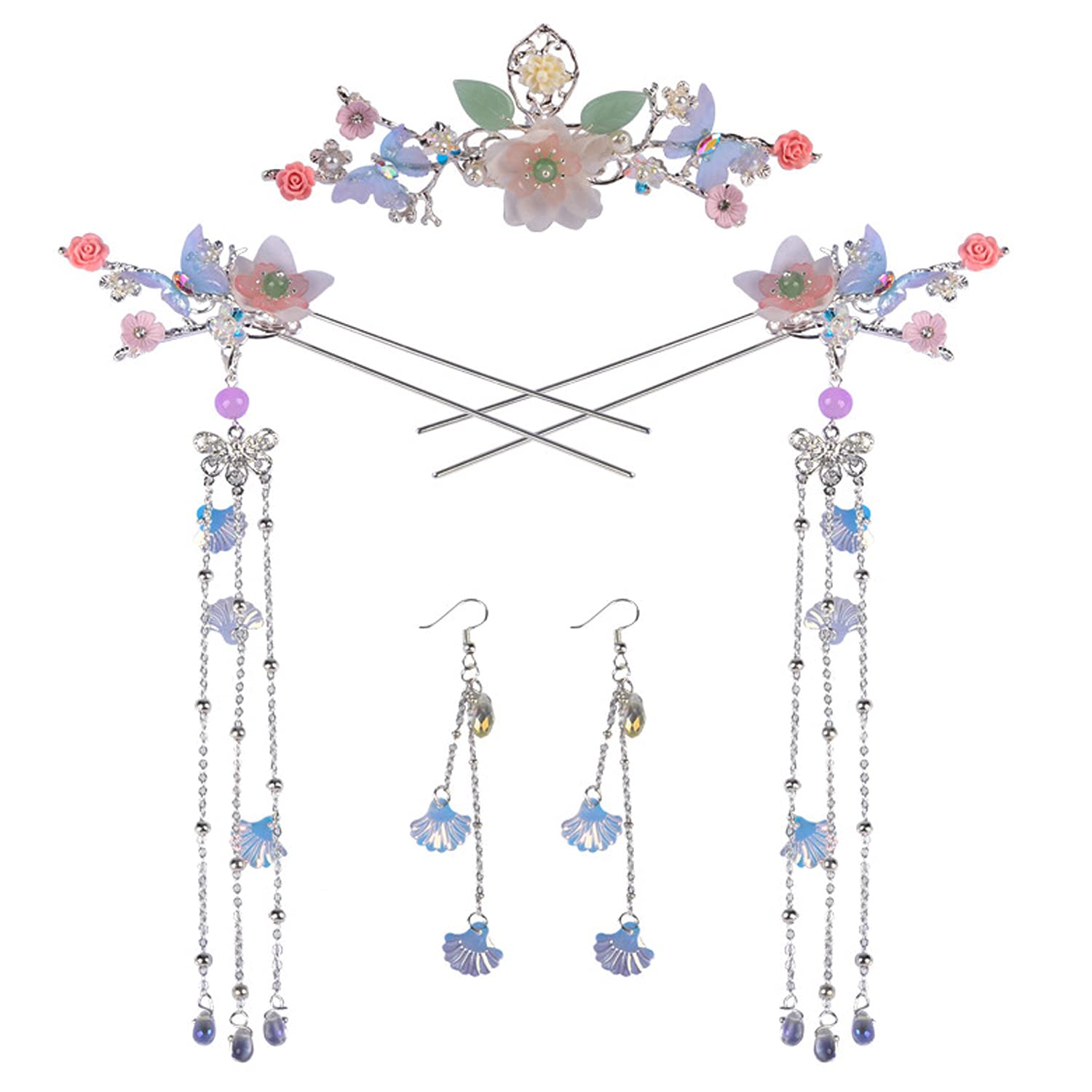 Details: Product Name: Hair Sticks Set. Material: Alloy, gauze. It's inspired by ancient Chinese women's hair accessory, and an absolutely elegant looking accessory for long hair. Vintage Chinese style design hair pins fit for weddings, proms, parties, birthdays, anniversaries and any other special occasions. Package:1 x Hair Sticks Set(1 Pairs HairSticks+1Pc hair comb+1 Pairs earrings).
