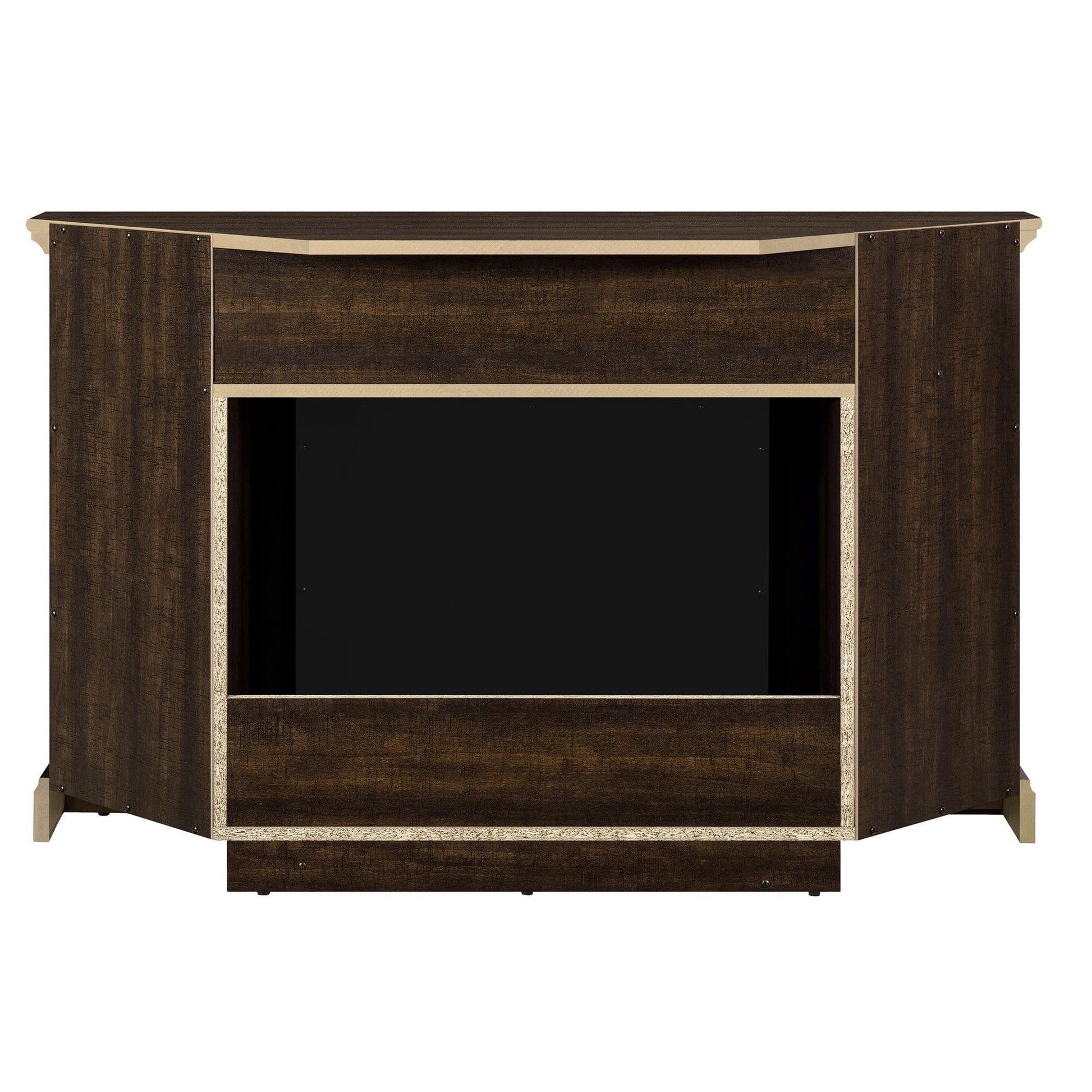 Details: Add some warmth to almost any room with the Ameriwood Home Overland Corner Fireplace TV Stand. This Fireplace fits conveniently in the corner to take up less space and can accommodate most TVs up to 50' wide or 60 lbs. The classic espresso finish on the laminated MDF and particleboard pairs with the faux stone around the 23' electric fireplace insert for an elegant look. The insert features a realistic flame effect that can be controlled with the included remote or touch panel. Even when the weather is warmer you can still enjoy the flame feature without the heat or put this Fireplace on a timer to shut off during the warmest parts of the day so you know your room will be the perfect temperature. The insert plugs into a standard 120V outlet and heats a room up to 400 square feet. The Stand offers 5 shelves to keep your AV components, books, DVDs and more. The Corner Fireplace TV Stand ships flat to your door and requires assembly upon opening. Two adults are recommended to assemble. Once assembled, the TV Stand measures to be 29.7'H x 47.6'W x 19.7'D.