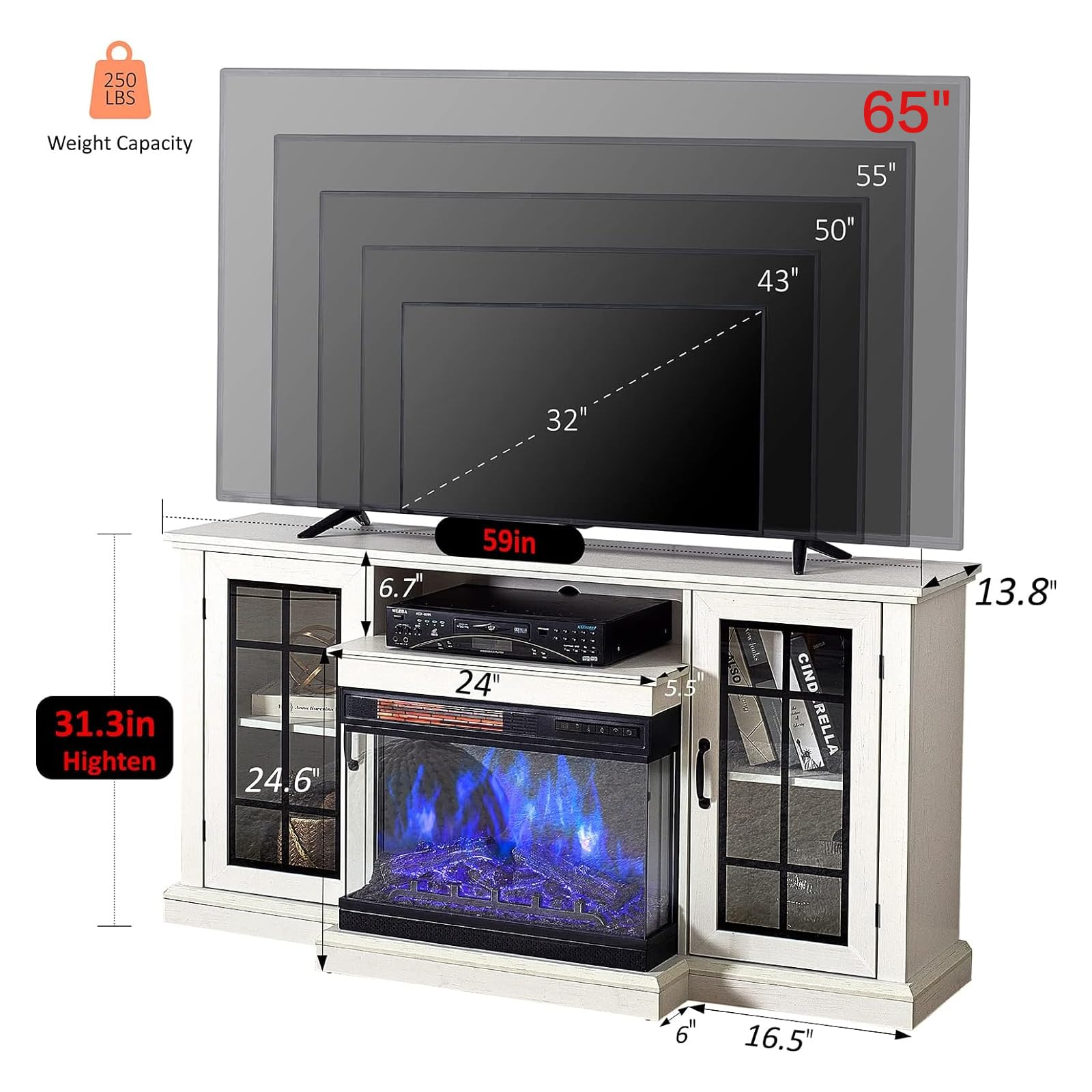 - Fits TVs 65''+ - AMERLIFE 59'' TV Cabinet can accommodate TVs up to 65'', including a 24'' fireplace. TV Stand Dimensions: 59 W x 13.8 D x 31.3 H in; Fireplace Dimensions: 24 W x 11 D x 18.5 H in.