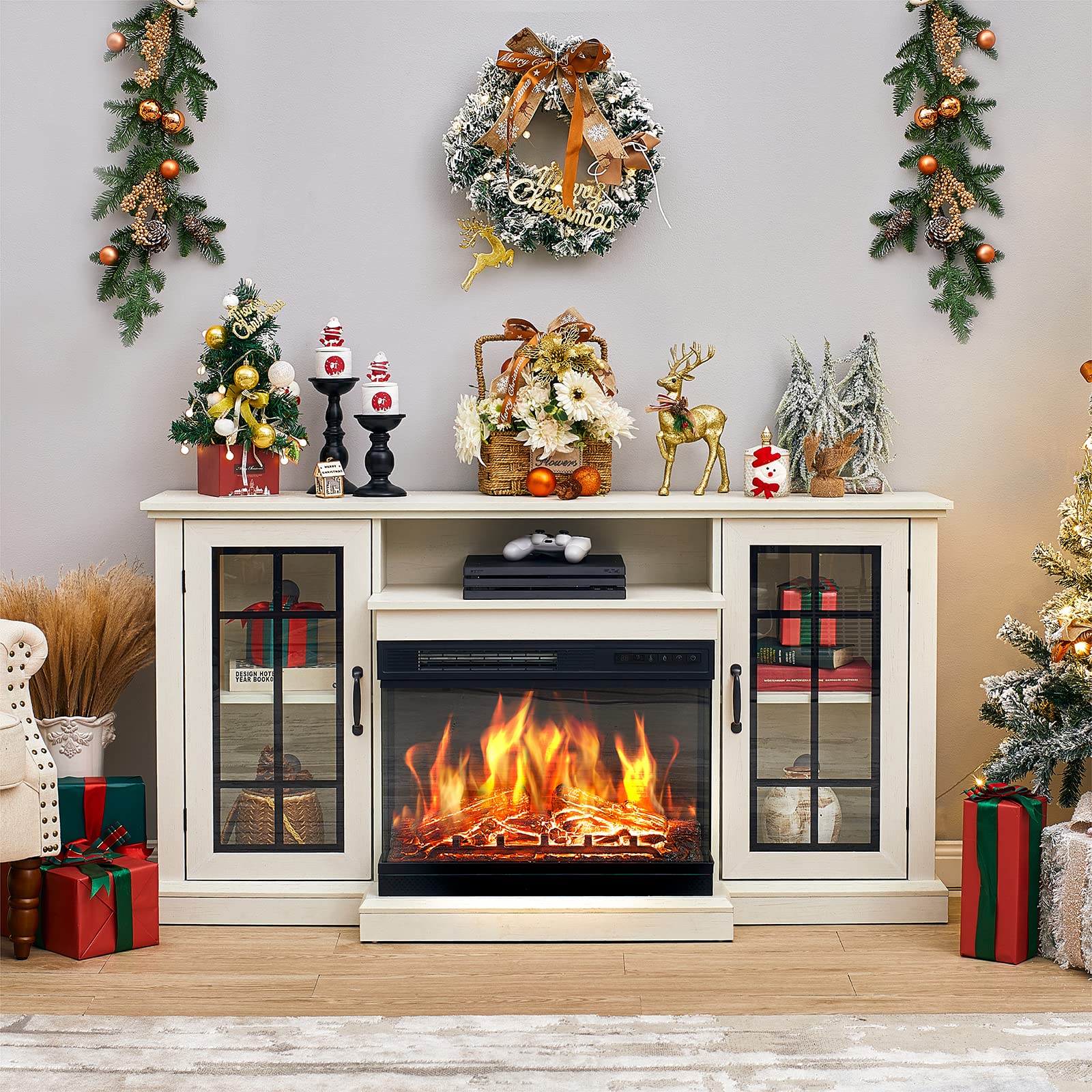 AMERLIFE 3-Sided Glass Fireplace TV Stand for TVs up to 65'' with 12 Color, Media Entertainment Center Console Table with Doors Closed Storage, Distressed White