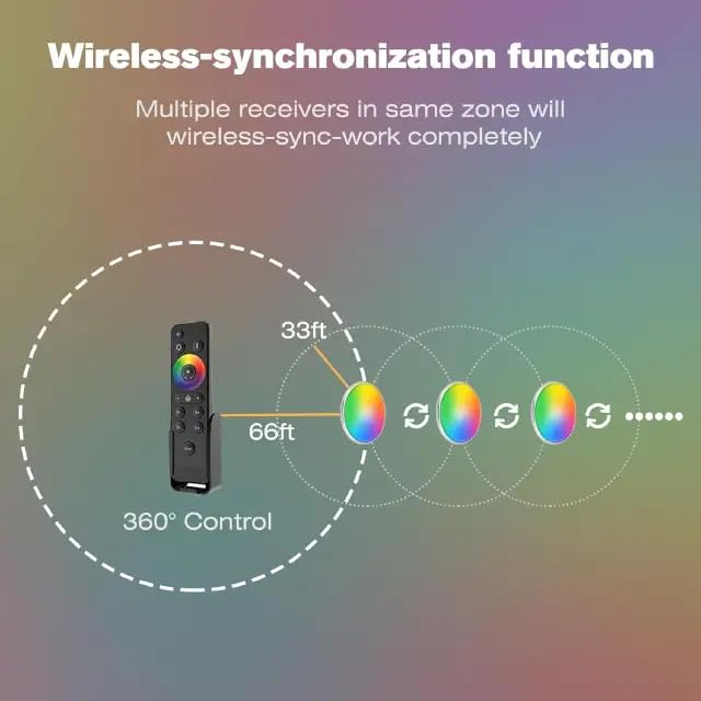 - 【Smart Remote Control】 Radio frequency remote control is used for wireless synchronization control, which is divided into two modes: static and dynamic. The radio frequency code matching/clearing between the remote control and the receiver can be operated in batches. It has a memory function and retains the mode it stopped when it was turned off every time it is turned on
