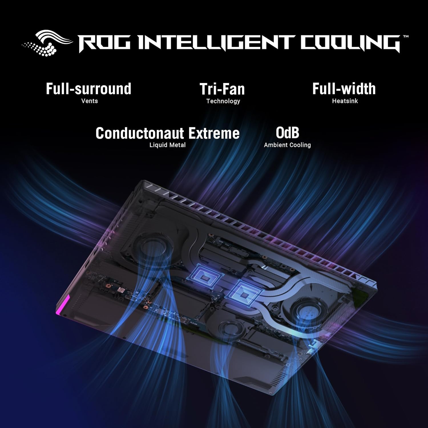 - Powerful Cooling System: In order to fully utilize the performance of hardware such as the CPU and GPU, ROG gaming laptops adopt the advanced design of ROG Glacier cooling architecture, which has three fans and seven heat pipes combined with liquid metal to transfer heat, ensuring high performance while maintaining a balance between low temperature and quietness