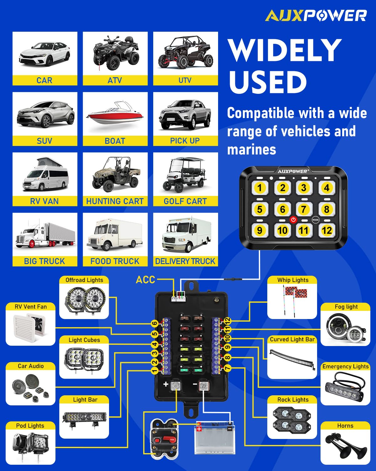 - 【APPLICATION】Automotive switch panel is suitable for most vehicles, such as trucks, boats, off-road vehicles, cars, marines, RVs, ATVs, UTVs, SUVs, etc. The AUXPOWER switch panel is the optimal choice for organizing and controlling your car accessories.