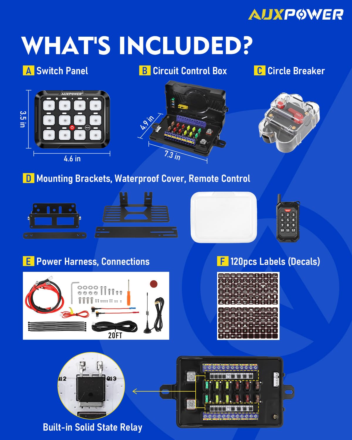 - 【SPECIFICATION】The maximum current is 100A, the voltage input is DC 12-24V, the power range is 1200W~2400W, and the working temperature range is -40~221°F. Auxpower is always devoted to producing innovative and high-quality switch panels. ATTENTION: WITHOUT APP FUNCTION