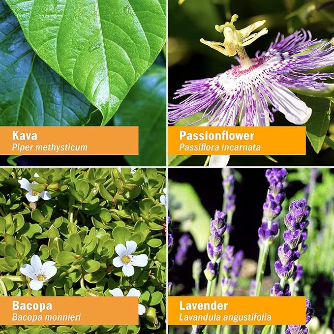 - Proprietary blend of Kava rhizome with root, Passionflower flowering herb, Bacopa herb, Albizia bark, Lavender flower extract and essential oil.