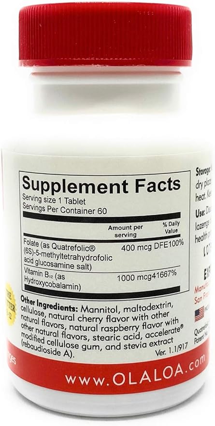 Ola Loa Vitamin B12 Sublingual Cherry Dietary Supplement - HydroxyCobalamin, Active Folate, Vegan Formula - Promote Your Body's Energy, Nerve, and Brain Support - 60 Tablets