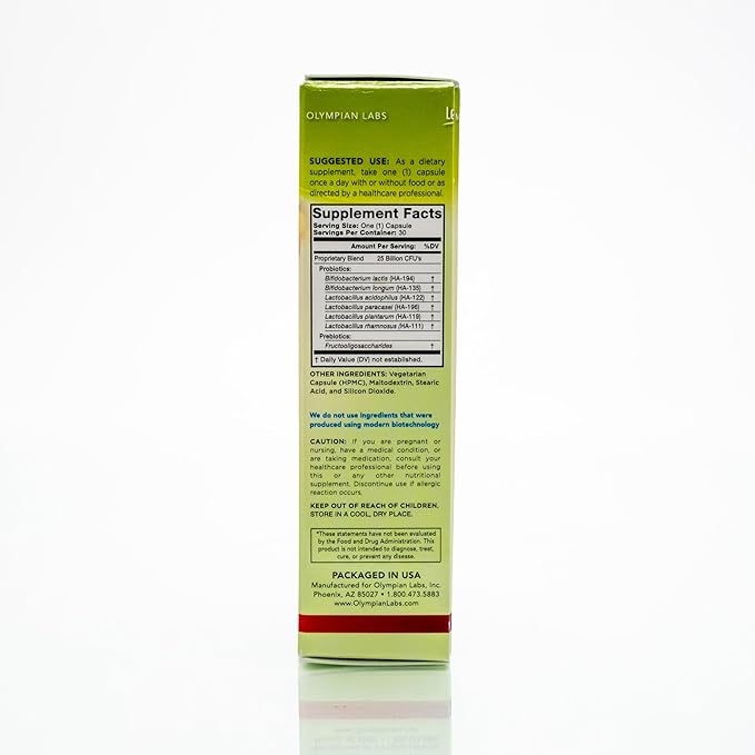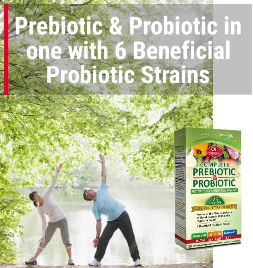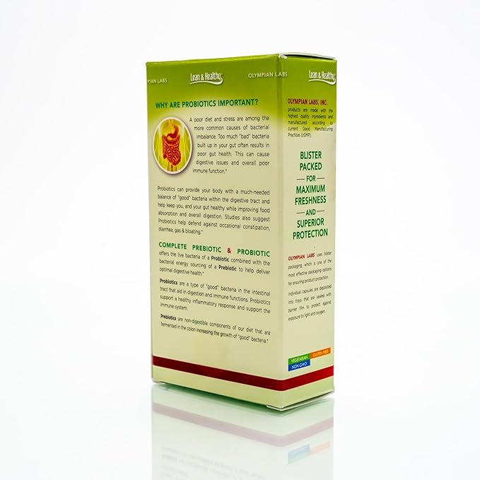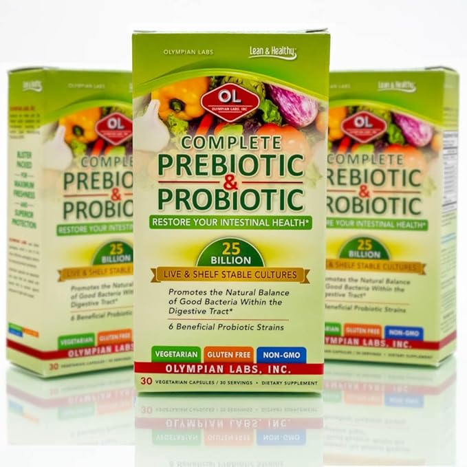 Olympian Labs Complete Prebiotic and Probiotic Supplement - 25 Billion Live Shelf Stable Cultures - 30 Vegetarian Capsules, Helps Restore The Natural Balance Within The Digestive Tract.