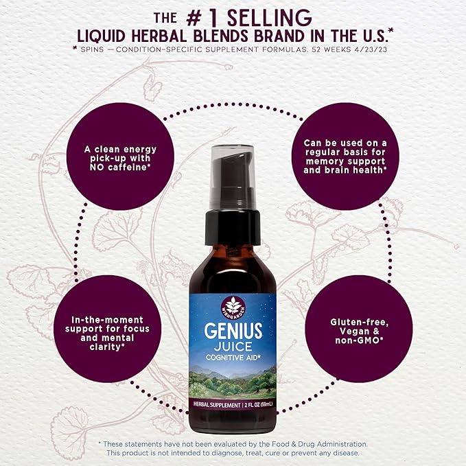 - ORGANIC & WILD-HARVESTED INGREDIENTS: Our staff of highly-trained certified herbalists use only quality-tested, non-GMO ingredients to produce our signature small-batch formulations that support our bodies in the way nature intended. Made with Gotu Kola aerials, Ginkgo leaf, Eleuthero root, Dandelion root, Cinnamon bark & Prickly Ash bark. Genius Juice memory and focus supplements for adults and seniors is gluten-free and vegan.
