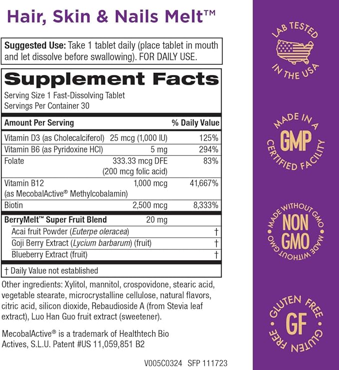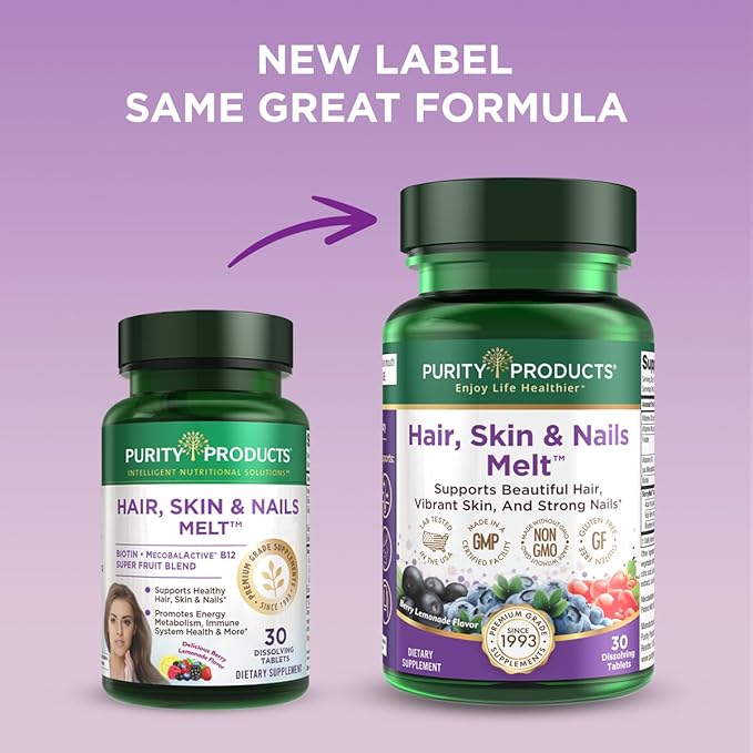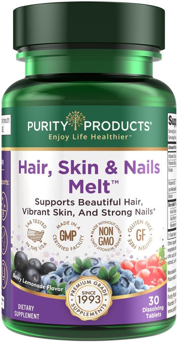 Purity Products Hair, Skin + Nails Melt 1000mcg B-12 + 2500mcg Biotin Energy Berry Melt - Delicious Berry Lemonade Flavor w/Super Fruits - B12 Methylcobalamin - 30 Melting Tablets