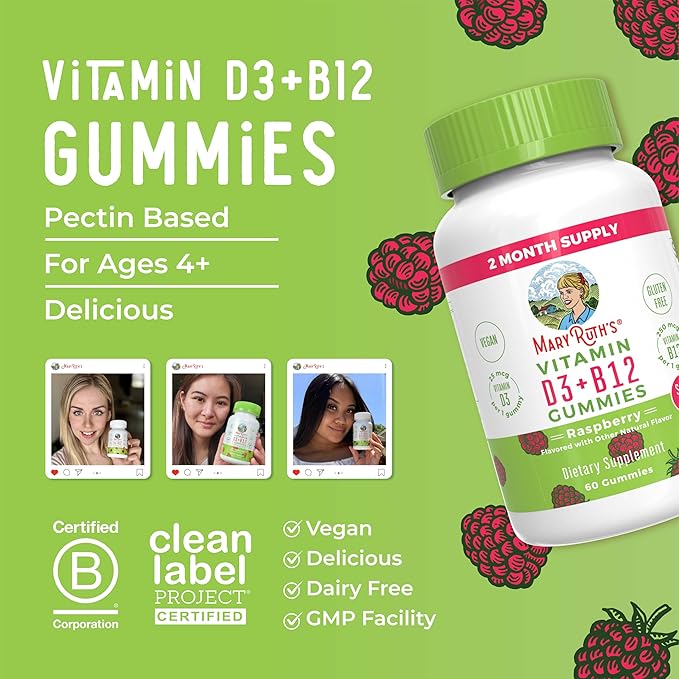 - For Most Lifestyles: Mary Ruths Vitamin D 3+B12 Gummies are Made With Organic Ingredients, Non-GMO, No Gelatin, Pectin Based, Vegan, Dairy Free, Gluten Free, Soy Free. Made in a GMP Facility. (*Vitamin D and B12 Gummies Contain Coconut). Clean Label Project Certified. B Corp Certified.
