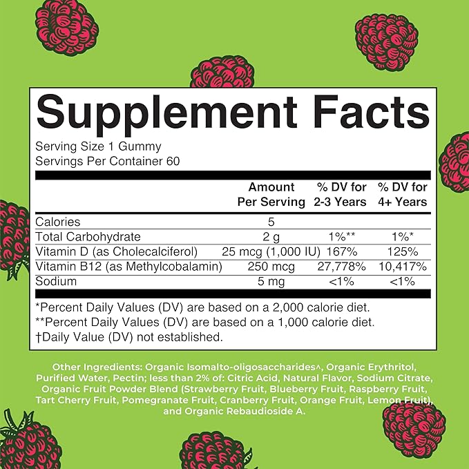 - Vegan Immune Support Gummy Vitamins: No more hard-to-swallow pills or capsules! Ages 2 and over can take 1 gummy per day as recommended by a physician or healthcare professional. Keep out of reach of children because of accidental overdose or choking. Each bottle of vitamin D3 and B12 gummies comes with 30-60 servings. Store in a cool, dry place.