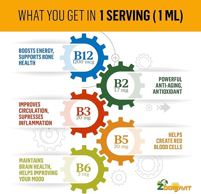 - Vitamin complex - Zoomavit liquid drops B complex contains vitamins B2, B3, B5, B6 and B12, which makes it a unique supplement that can help your mind and body get extra energy, mental balance and immune system health.
