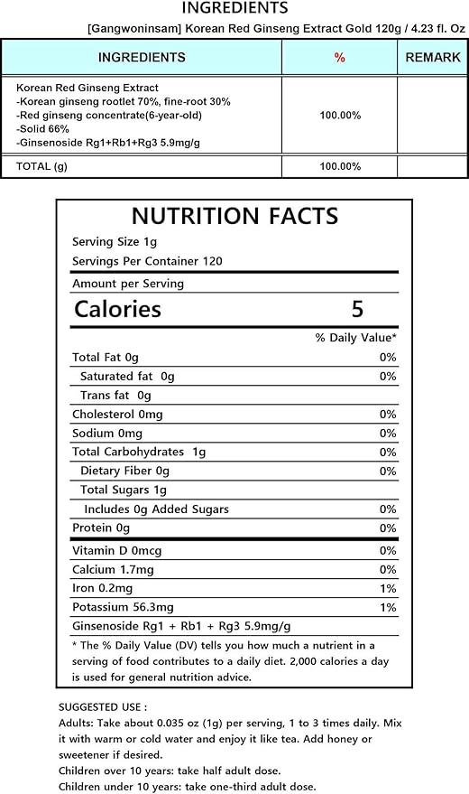 - NO ADDITIVES, KOREAN RED GINSENG CONCENTRATE 100% - Gangwoninsam Red ginseng concentrate is a pure concentrate obtained by extracting only 6 years old red ginseng produced by 100% contract cultivation.