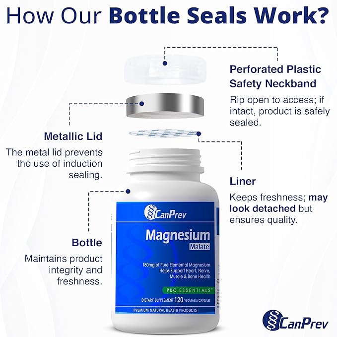 - Elevate Your Daily Vigor: CanPrev Magnesium Malate offers a delightful boost to your everyday energy. The special combination of magnesium and 540 mg of malic acid works to support your body's natural energy processes, helping to lessen feelings of tiredness and promote a lively sense of well-being. This vegan magnesium is perfect for those who lead busy lives or need a gentle pick-me-up during the day, allowing you to enjoy your activities with renewed enthusiasm and sustained vitality.