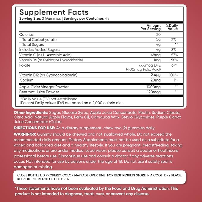 - DETOX, CLEANSE, DIGESTION, & METABOLISM - Our gummies are loaded with vitamins such as apple cider vinegar B12 and multivitamins like Vitamin C, Vitamin B6, and Vitamin B9 (Folic Acid), all known to support metabolism and help you feel fuller. Apple cider vinegar powder and beet powder help break down food efficiently for easier digestion, followed by detox. Made with handpicked ingredients, these ACV gummies support your workout regimen and internal wellness.