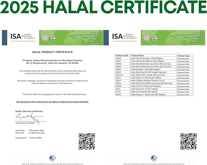 - SOFT AND NATURAL GUMMIES: Our Halal Adult Multivitamin Gummies are purely natural with no additives or preservatives. Each multivitamin gummy contains a potent mix of vitamins A, C, D, B, Iodine, Zinc, Citric Acid, Coconut Oil and a careful selection of natural fruit flavors. Every gummy is Soy-free, egg-free, dairy-free, non-GMO and 100% Certified Halal by Islamic Services of America.