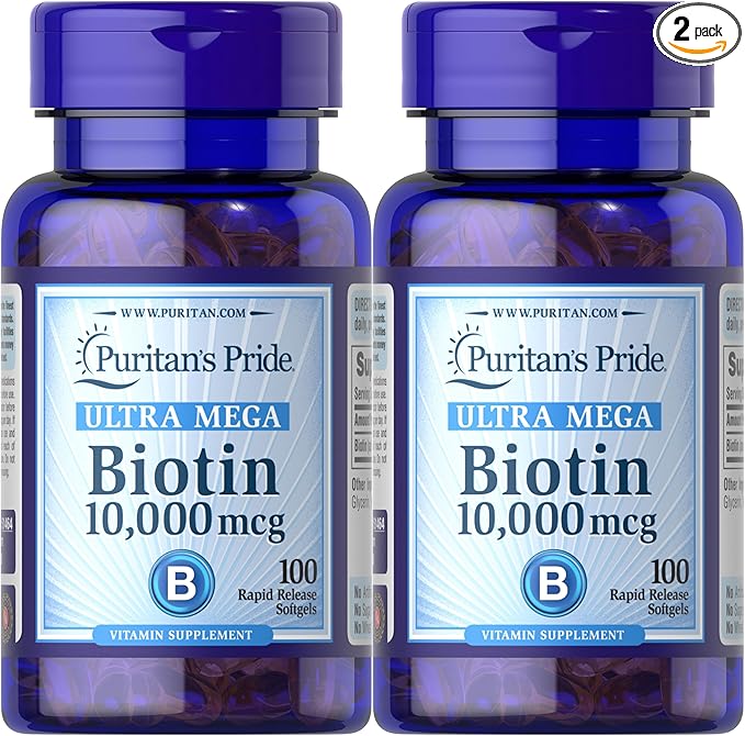 Puritan's Pride Premium Ultra Mega Biotin 10,000mcg, Dietary Supplement for Healthy Hair, Skin, Nails, and Energy Metabolism Support, 100 Day Supply, 100 Rapid Release Softgels, 2 Pack