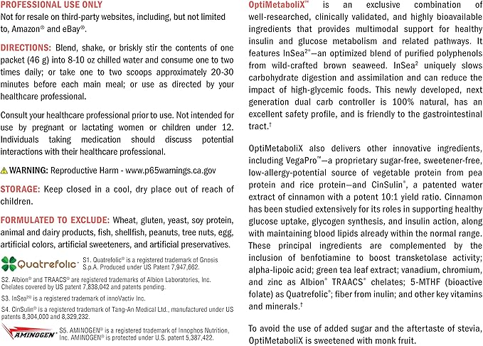 - Protein-Rich - OptiMetaboliX 2:1 delivers b12 vitamins, a folate supplement, and VegaPro — a proprietary sugar-free, sweetener-free, low-allergy-potential source of vegetable protein from pea protein and rice protein. It also includes CinSulin, a patented water extract of cinnamon with a 10:1 yield ratio.