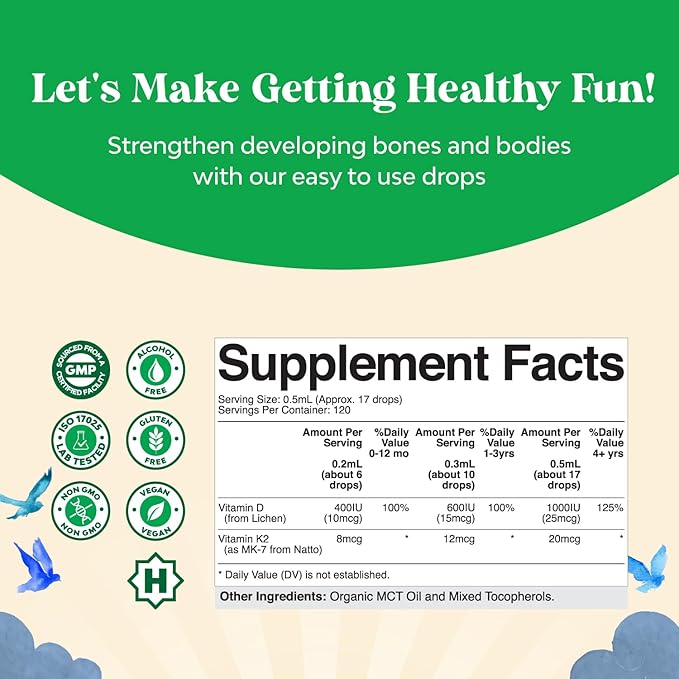 - Tummy-Friendly for All Ages - Say goodbye to fussing with our easy to take liquid vitamin D3 and K2 drops that are packed with vitamins that help your little one build a strong body and immune system