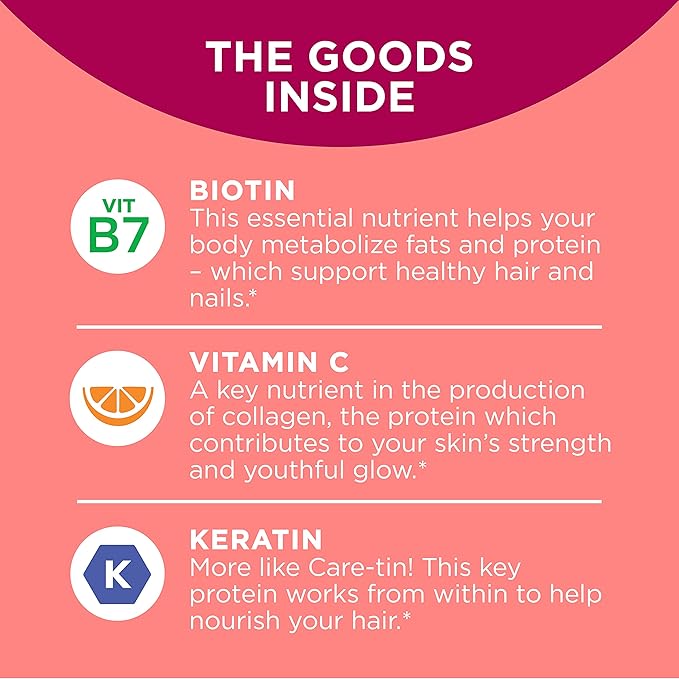 - THE GOODS INSIDE: Biotin is an essential nutrient to support healthy hair and nails. Vitamin C is a key nutrient in the production of collagen (the protein that contributes to your skin's strength and youthful glow) and Keratin helps nourish hair*