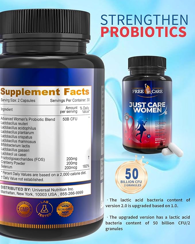 - Targeted Women's Health Probiotics: Formulated with 8 key probiotic strains, including Lactobacillus rhamnosus, Lactobacillus acidophilus, and Bifidobacterium lactis, to support and tract health while also aiding digestive and immune system balance.