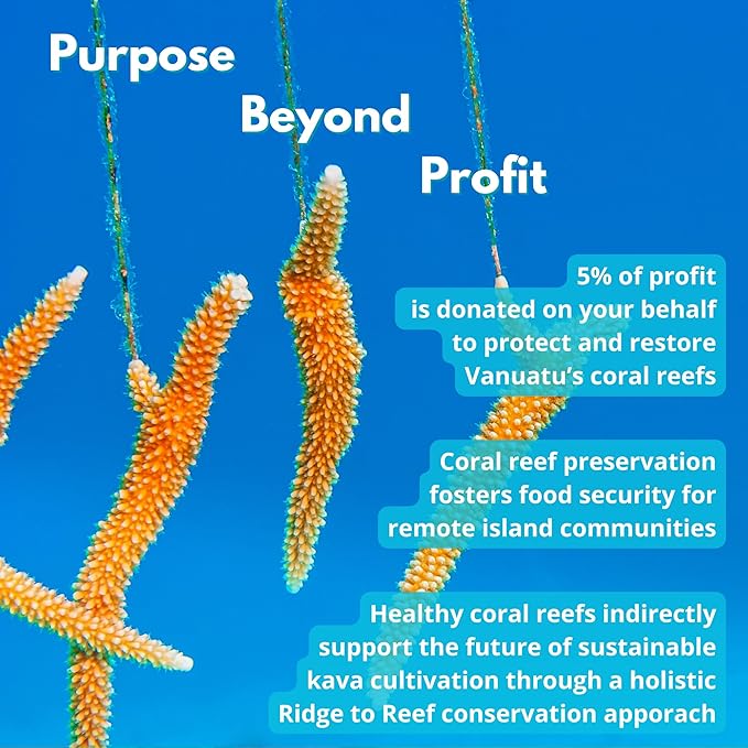- A Brand with Purpose: With every purchase, you’re not just choosing an exceptional relaxation aid; you’re supporting a greater cause. We donate 5% of profits towards coral reef restoration in our kava sourcing regions, fostering environmental sustainability and food security for remote island communities.