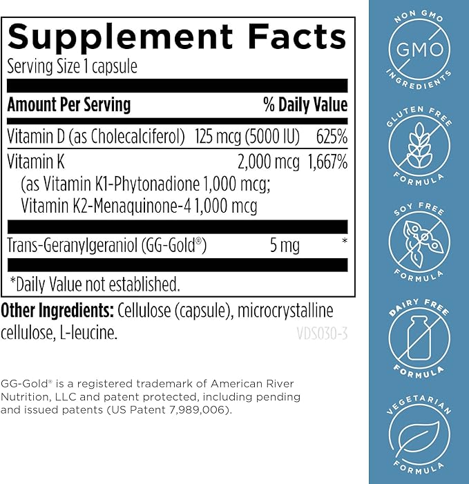 - Upgrade Your Vitamin D K - Each small easy-swallow capsule features clinically relevant amounts of bioavailable vitamin d3 (5000 IU), combined with 2000 mcg of vitamin K1 and K2. GG is also included as a complementary bone and immune supportive compound.*