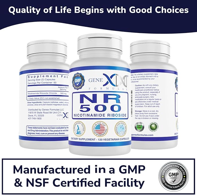 - PURCHASE WITH PEACE OF MIND - Our Nicotinamide Riboside is encapsulated, bottled, and tested in a GMP and NSF-certified facility in the USA. Genex Formulas believes in your health. That's why all our supplements are Non-GMO, Gluten Free, vegetarian, and made with only the best quality ingredients.