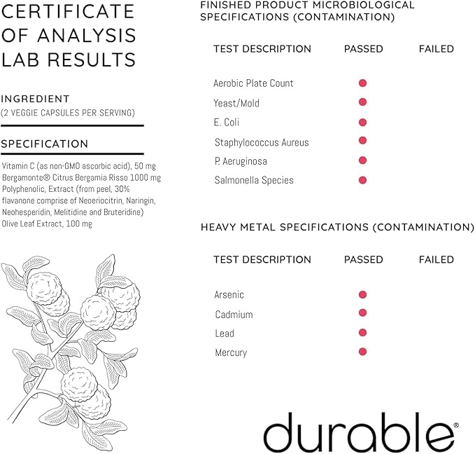 Durable Heart - Extra-Strength 1000 mg Bergamonte Citrus Bergamot + Olive Leaf Extract +Non-GMO Vitamin C – Natural Heart Health Supplement for Healthy Cholesterol Support – Made in the USA (3 Bottle)